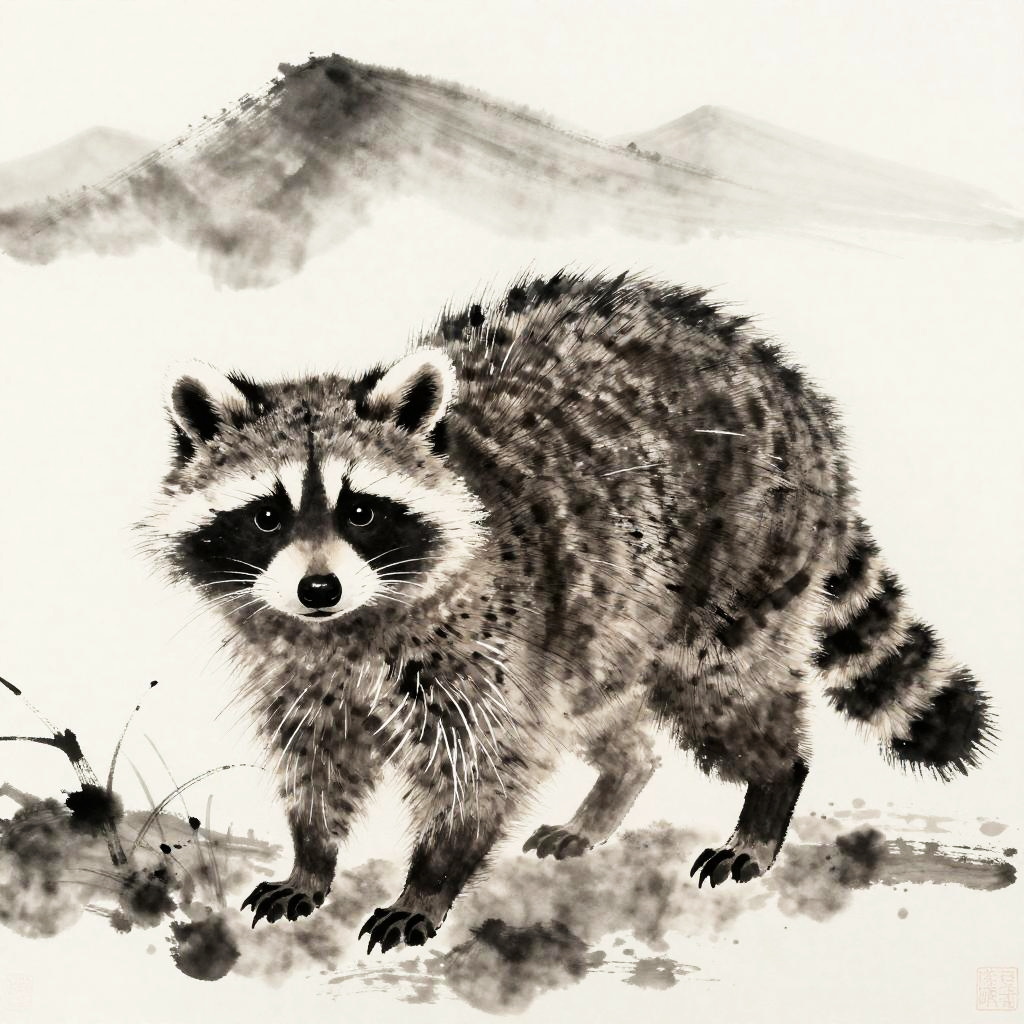 Raccoon dog drawing in traditional ink wash style, monochrome palette with varying shades of black and grey, elegant brush strokes capturing fur details and expressive eyes, misty mountain background evoking Japanese sumi-e art with minimalist composition.