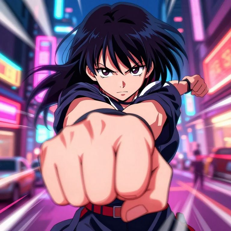 Anime-style digital drawing of a determined girl with black hair and intense eyes, extending her fist towards the viewer in a neon-lit urban street at night