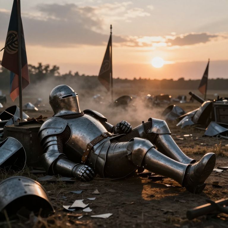 Photograph of a fallen silver knight in full armor, surrounded by scattered helmets and flags, at sunset in a dusty battlefield.