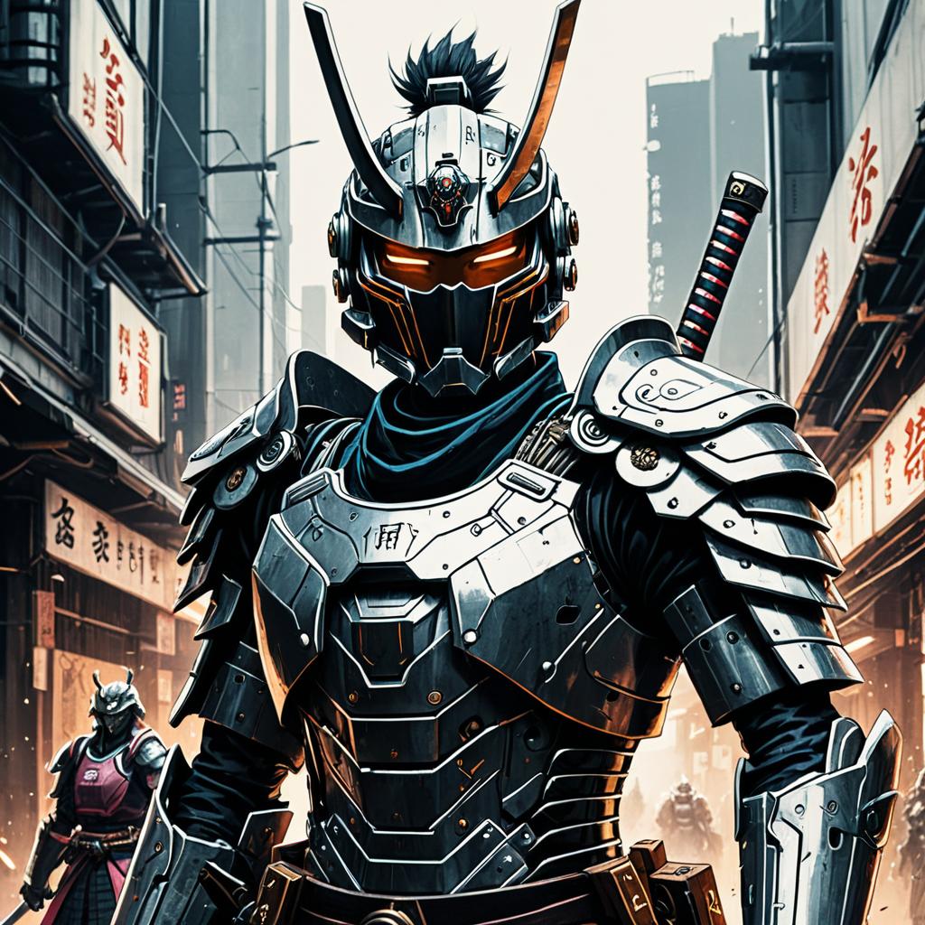 Portrait of a confident futuristic warrior wearing sleek, metallic armor with a distinctive helmet, standing in a neon-lit cyberpunk city street. The armor features intricate, angular designs with reflective blue and purple hues, highlighting advanced technology. The urban background is filled with glowing signs and high-tech buildings, emphasizing a sci-fi environment.
