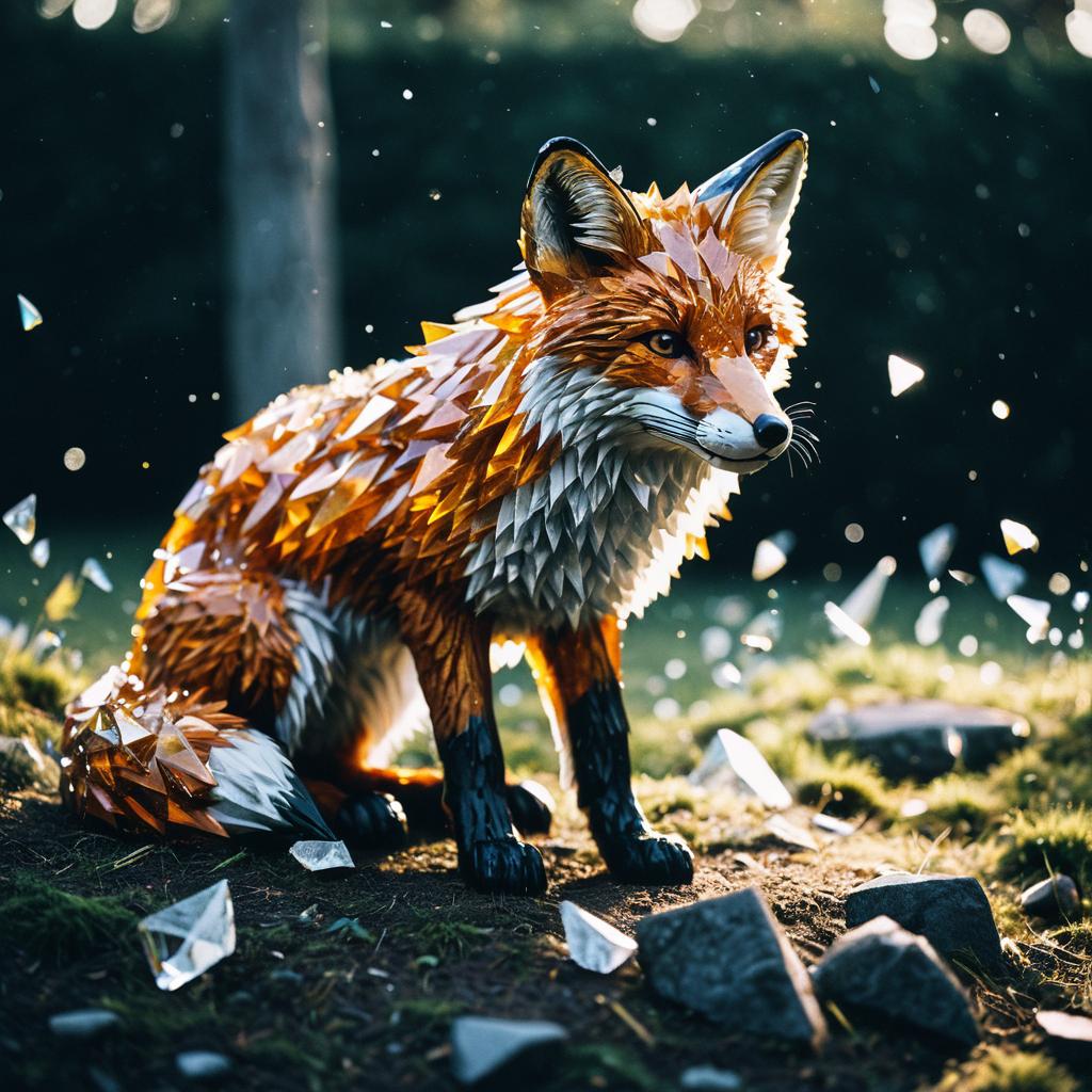 Composite image of a fox made of bark, captured with a 105mm lens, f/2.0 in an ethereal outdoor setting with sharp focus and dreamy lighting.
