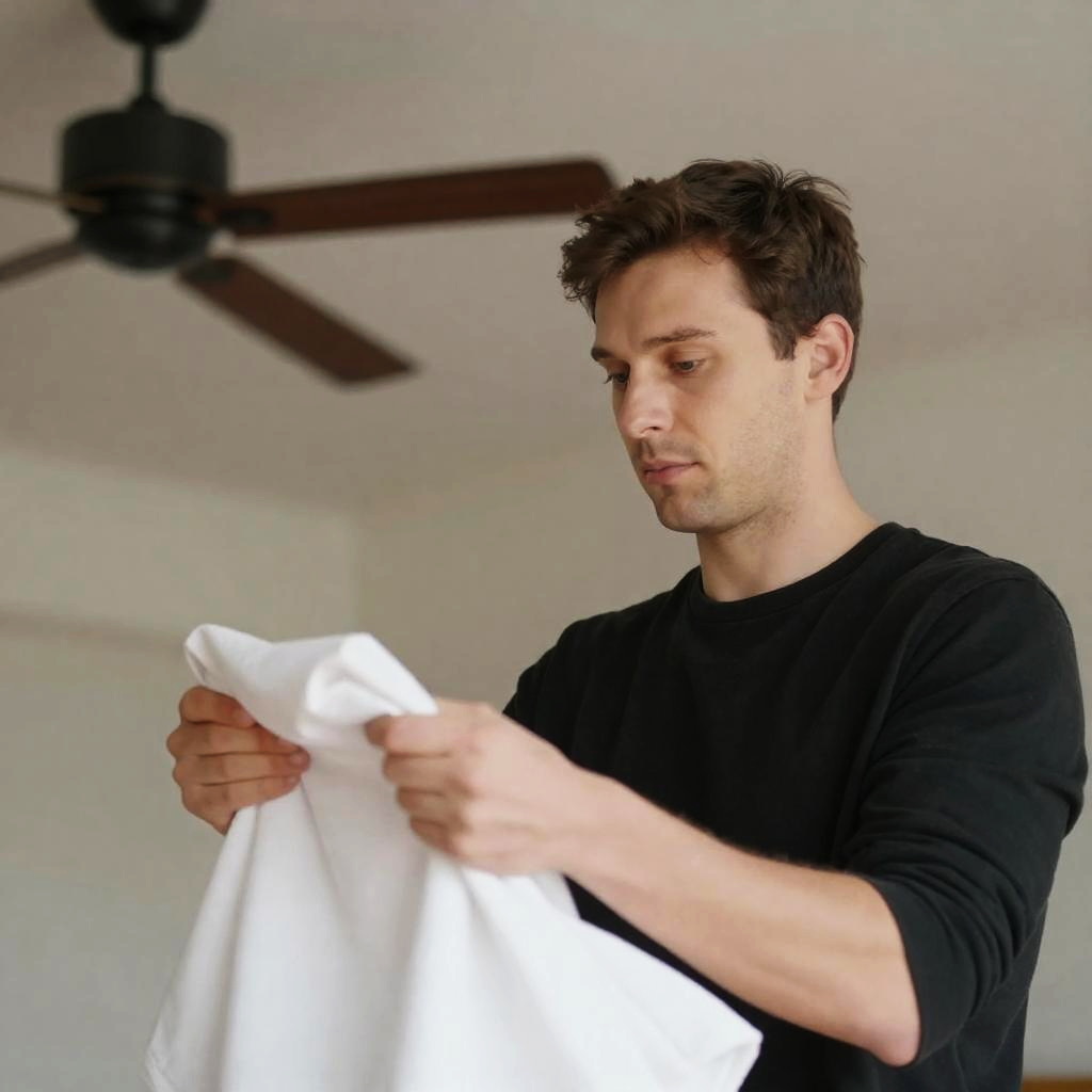 Photograph of a man with short brown hair, wearing a black long-sleeve shirt, holding a white cloth, looking slightly downward. Background includes a ceiling with a black and wooden fan, and soft indoor lighting. Man's face is neutral.