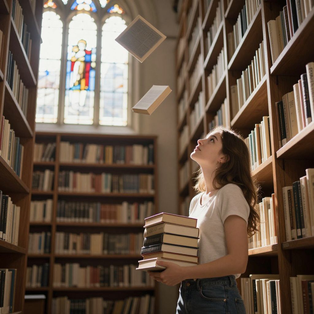 Books flutter gracefully through the air like birds, escaping the weight of emotion as they soar above a young woman standing amidst towering wooden shelves in a sunlit library, her hands gently cradling a stack of volumes while sunlight streams through stained glass windows.