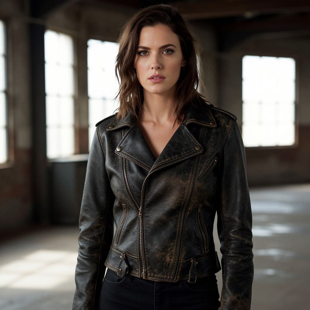 Portrait of a woman inspired by Olivia Wilde wearing distressed leather jacket, rustic industrial warehouse setting, natural light streaming through large windows, moody and atmospheric composition, detailed leather texture and strong character presence.