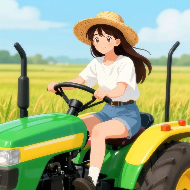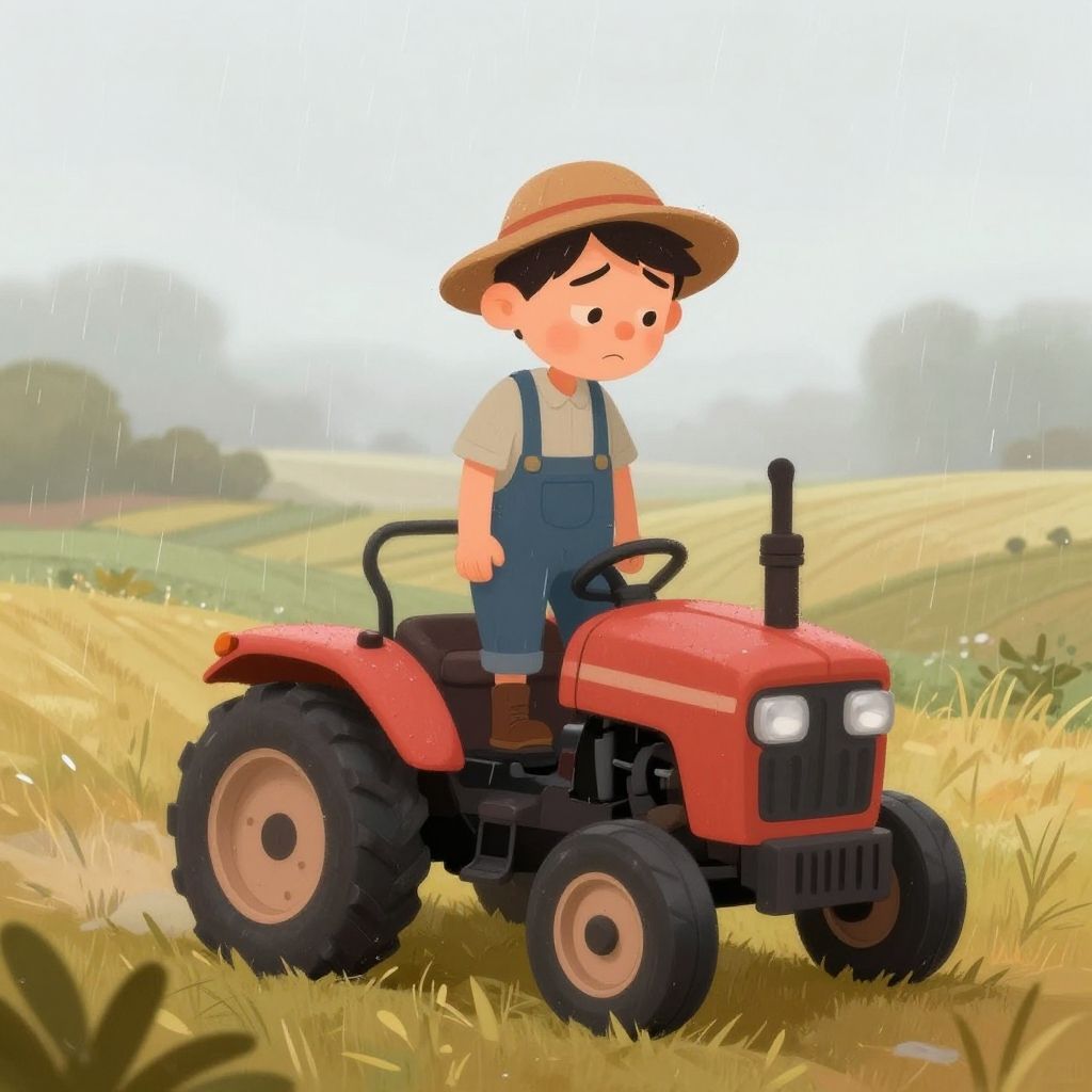 Sad farmer cartoon standing on a tired tractor, rain falling gently, expression of hopelessness and fatigue, rolling fields fading into mist with soft highlights