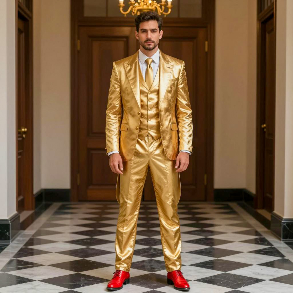 Male party costume, photorealistic portrait of a handsome man, standing in an elegant hallway, wearing a gold metallic suit with long tails, gold vest, white shirt, gold tie, red shoes, black and white checkered floor, dark wooden door in the background, ornate golden chandelier, short dark hair, trimmed beard, serious expression, daytime lighting, fashion photography style