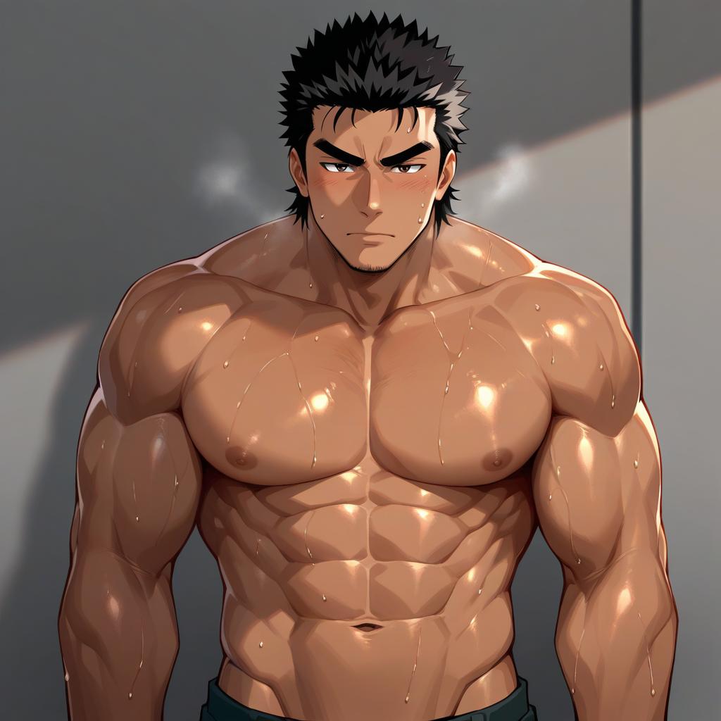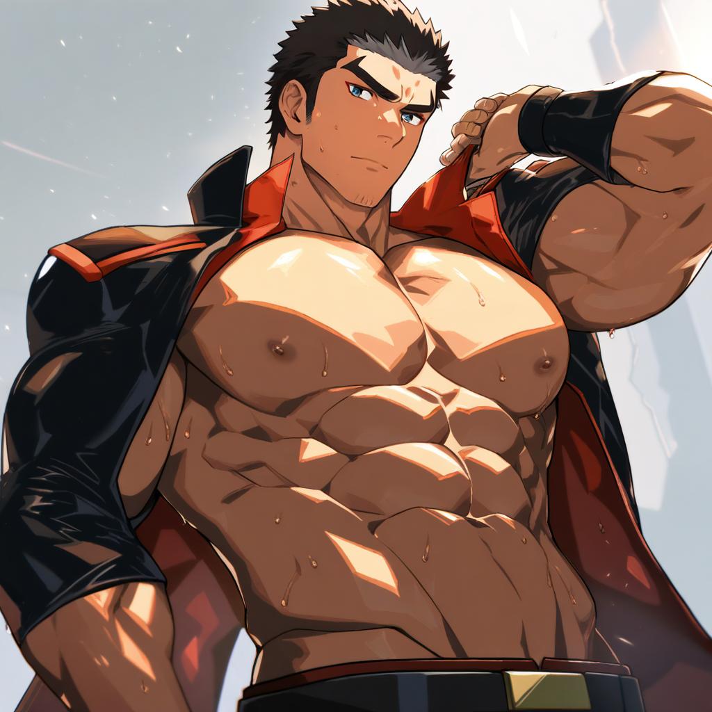 Digital illustration of a muscular dark-skinned anime male with short black hair, thick eyebrows, and black eyes. The character is shirtless, showing large pectorals, defined abs, and sweat droplets on his skin. He wears dark pants and has a black jacket slipping off his shoulders. The image features strong shading and highlights typical of modern anime artwork, created by the artist Saikawa Yusa.