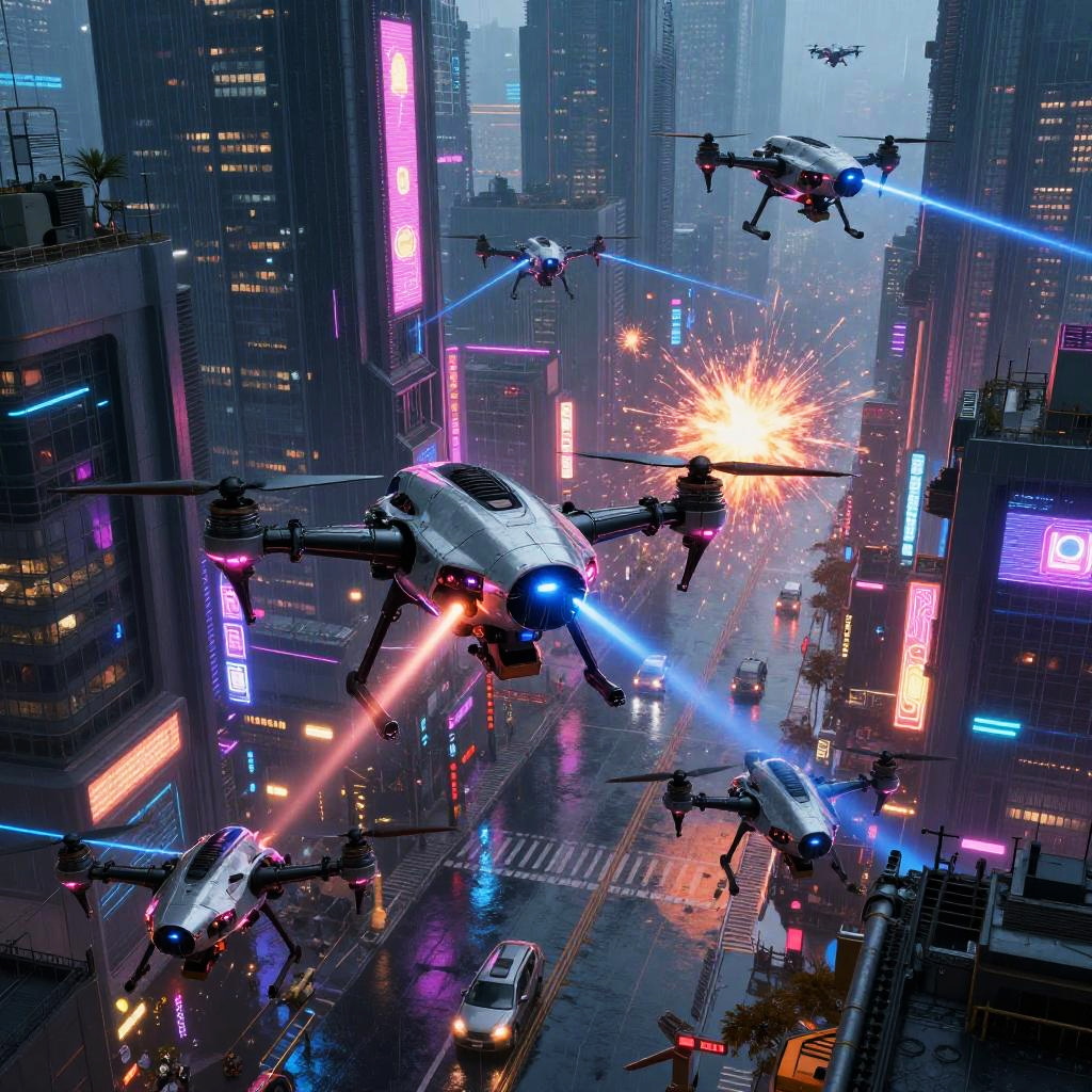Futuristic Drone Swarm Cyberpunk Attack
