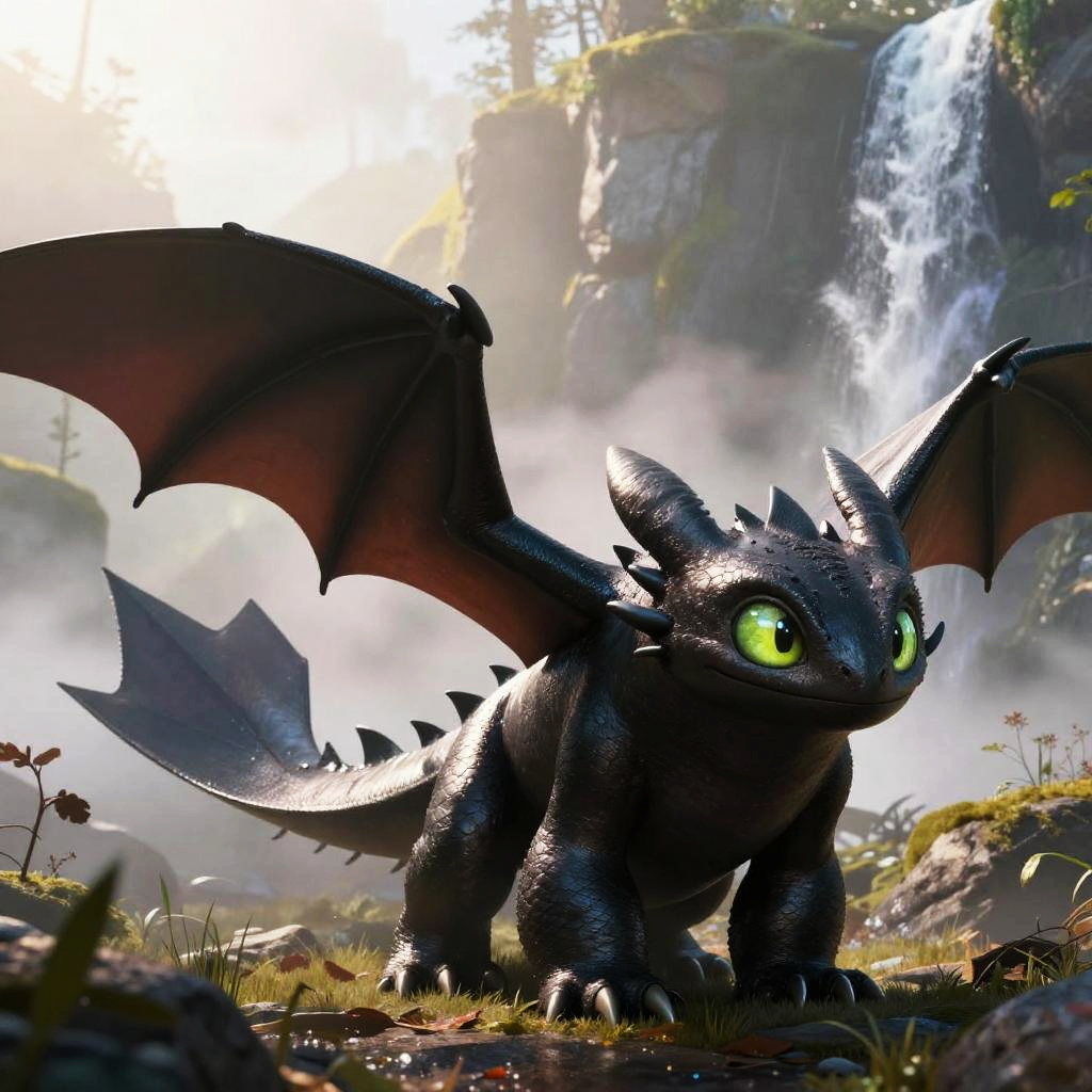 Uploaded on e621, (((by Ando Fuchs, by Scavy, by Chumbasket, by Artur Bordalo))), solo (((feral Toothless))) with (((grey black body))) and (black claws) and ((membranous wings)) and (clear green yellow eyes), , ((three-quarter portrait)), (((nude))), (detailed feral lizard Toothless), (detailed lighting), (detailed glistening scales), (((all fours at mist mountain with plant and waterfall))), (fog), ((yellow lighting)), ((blue lighting)), (smile), ((sunlight)), (cinematic lighting), ((detailed background)), ((depth of field)), (half body shadow), (looking away), (low-angle view), ((three-quarter view)), [backlighting], [detailed ambient light], [gray natural lighting], [ambient light on the belly], [realistic proportions], [explicit content, adult, nsfw], [sharp focus], (questionable content), (shaded), (hi res), ((masterpiece))