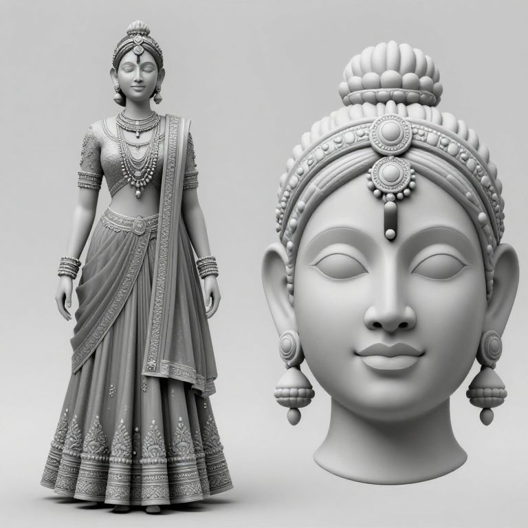 Focus Shot On The Style Inspired Clothing, depth map, greyscale 3d image of indian face with ornaments, 3d stereographic photo,