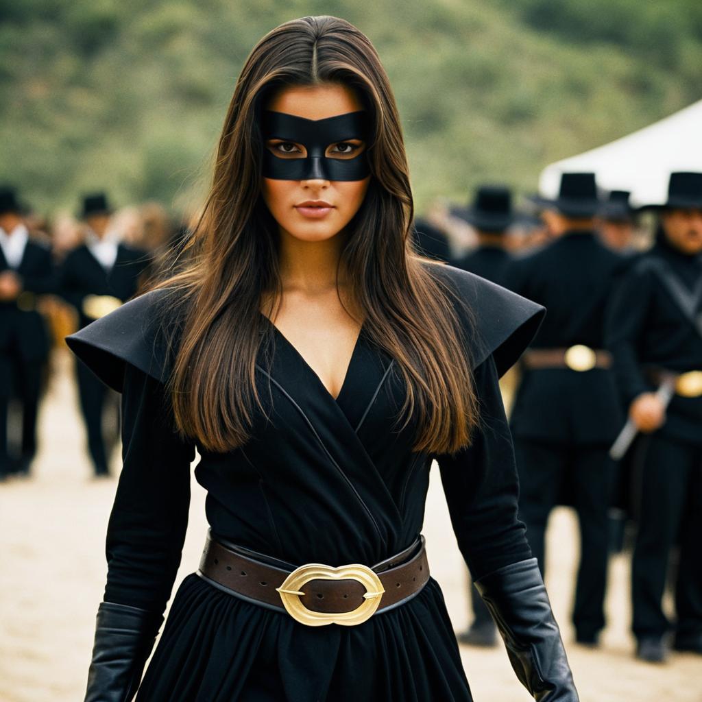 Woman zorro costume,solo, 1girl, long hair, mask, belt, looking at viewer, blurry background, blurry, brown hair, realistic