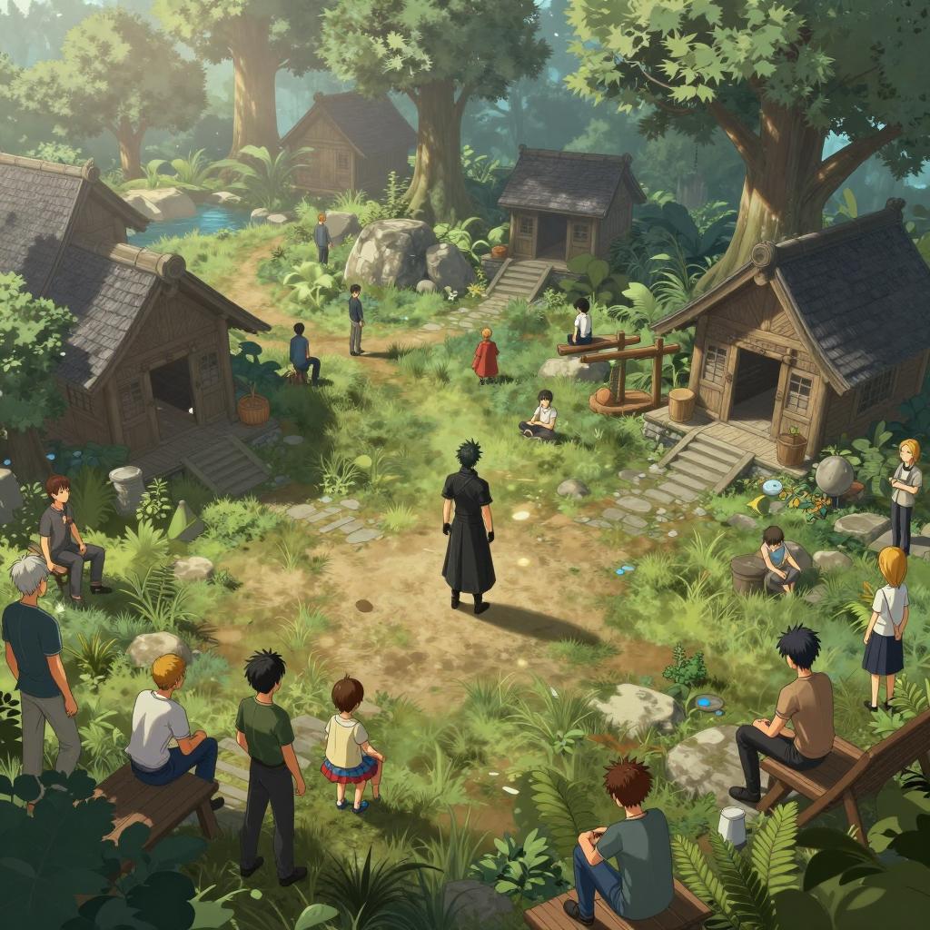 Highly detailed and colorful digital illustration depicting a group of diverse people gathered in a forest village clearing surrounded by wooden houses. The central figure is a solitary person in a dark cloak standing in the middle of the clearing, emphasizing the theme of loneliness despite being surrounded by others. The scene is set in a lush, green forest environment with radiant sunlight filtering through the trees, illustrated in a style reminiscent of fantasy video games with intricate textures and global illumination effects.