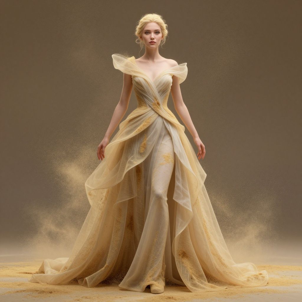 Kitsch ethereal woman wearing avantgarde dresses made of golden dust,fantasy atmosphere, 3D render, hyperrealism,