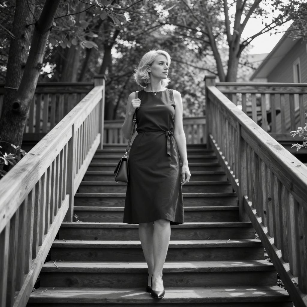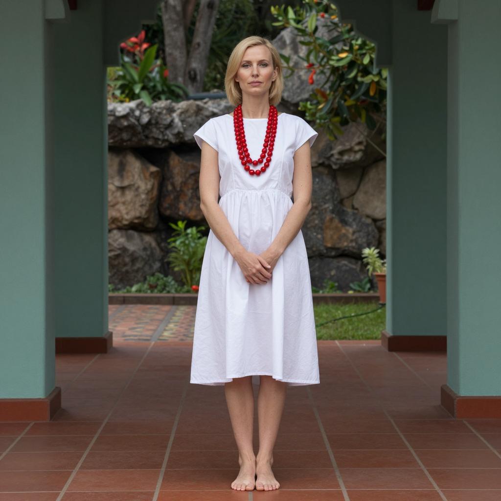 A blonde woman with fair skin stands barefoot on a red-tiled floor, wearing a white dress with a red beaded necklace. She holds her hands together in front of her. The background includes green geometric structures, a rock wall, and a garden with trees and bushes. She is centered in the image, looking slightly to the right.