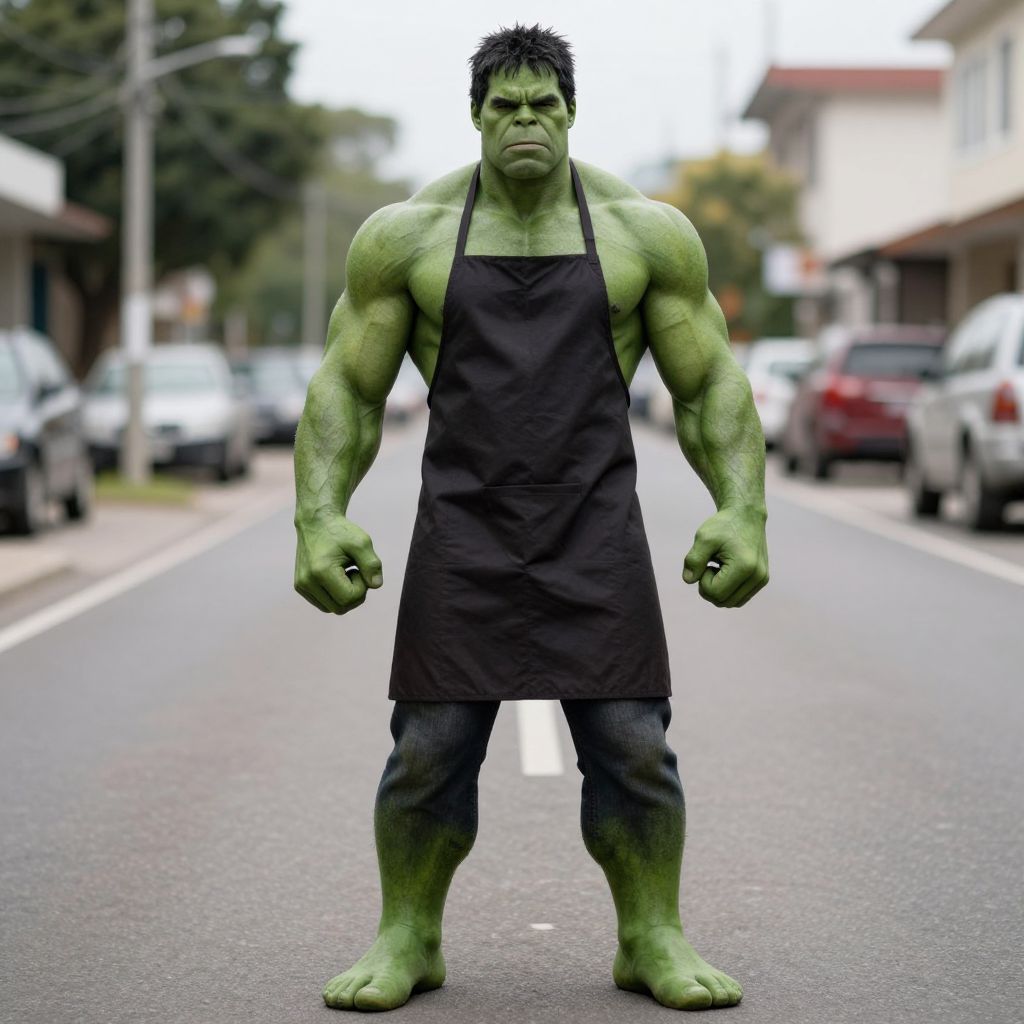 Photograph of a green-skinned, muscular Hulk character standing on a suburban street. He wears a black apron over dark pants and is barefoot, with short black hair and a stern expression. His large, flexed arms and fists are prominent. The background shows a slightly blurred street with parked cars, buildings, and trees on either side, under an overcast sky. The Hulk's exaggerated physique and vibrant green skin contrast with the mundane urban setting. The image combines realistic street photography with the fantastical appearance of the Hulk.