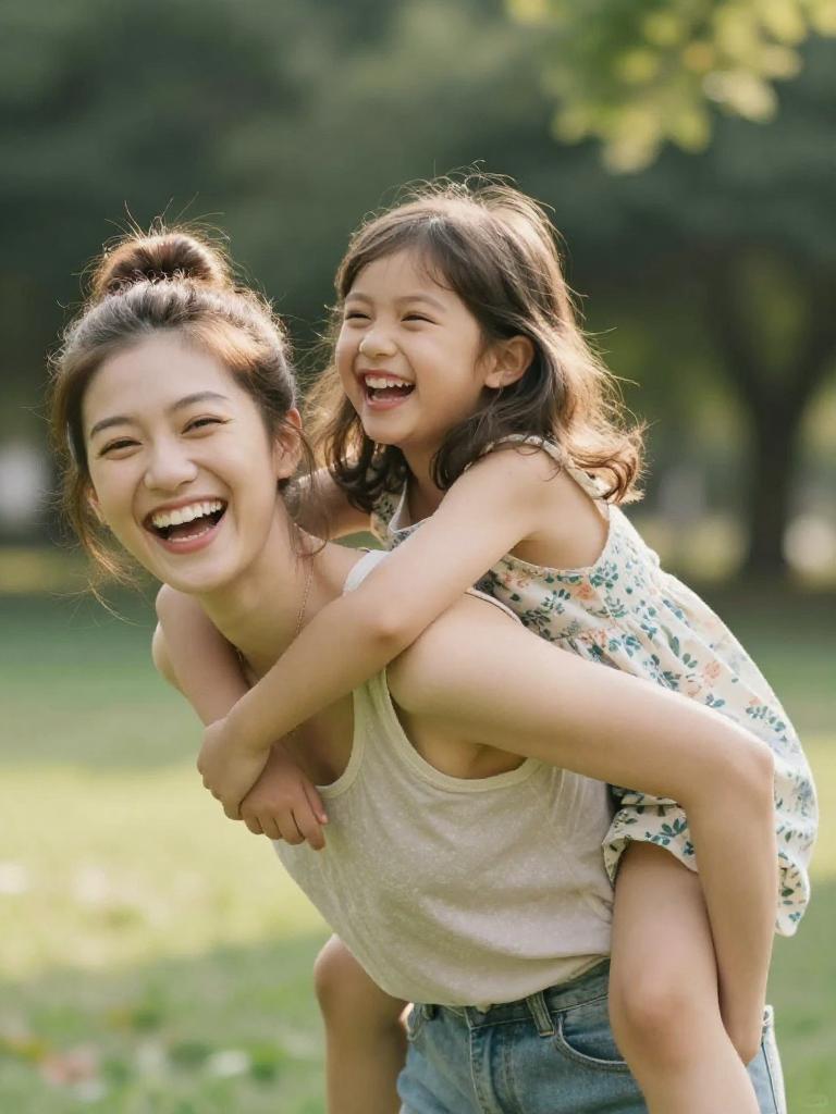 Mother and daughter, playful moment in the park with the daughter riding on her mum's back, both laughing, mum with light-brown hair in a messy bun and happy eyes and girl with shoulder-length waves and laughing expression, mum in casual tank top and daughter in cotton dress, blurred green trees and sunlit grass in the background, candid outdoor family lifestyle stock photo, high resolution, ultra-detailed