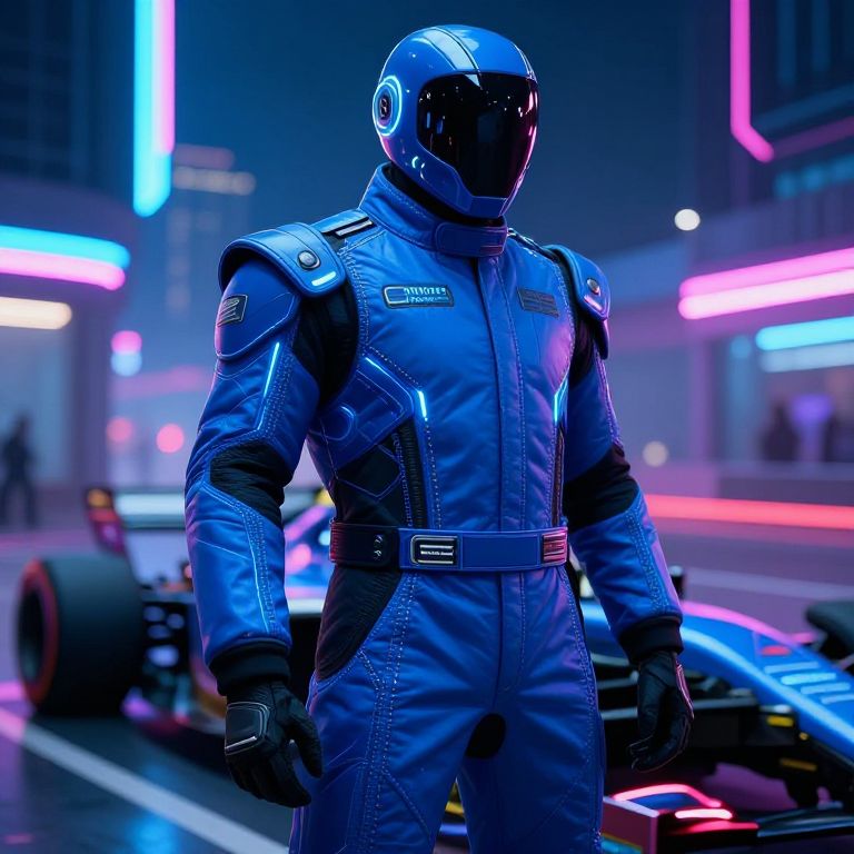 Futuristic blue racing suit equipped with LED highlights and protective armor, driver preparing for race in neon-lit urban circuit, cyberpunk atmosphere, detailed suit stitching