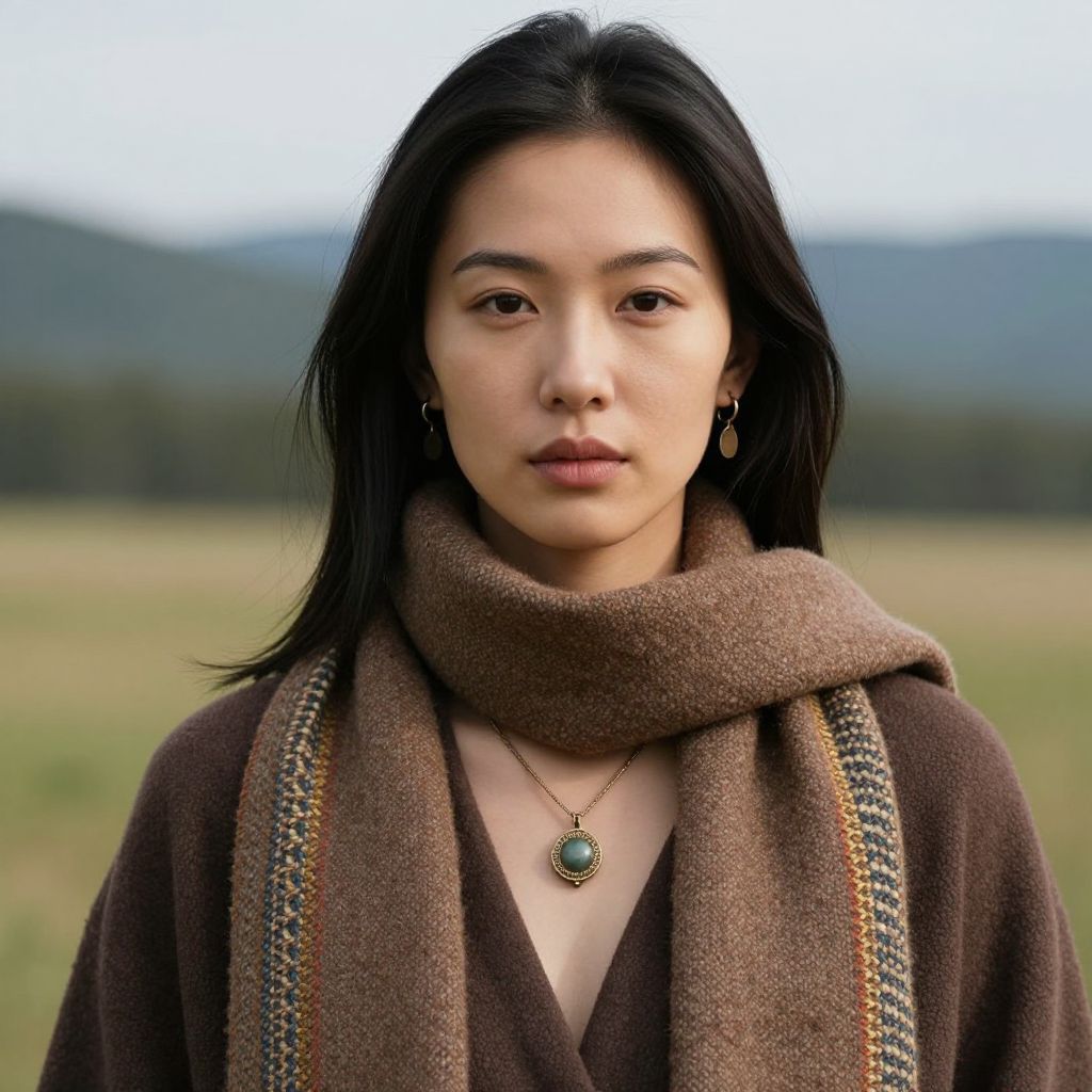 Photograph of an East Asian woman with straight black hair, wearing a brown, textured scarf and a brown woolen coat with a patterned trim. She has a calm expression with subtle makeup, small hoop earrings, and a green pendant necklace. The background is a blurred, grassy field with distant, hazy mountains under a pale sky. Her skin is smooth and light, and she stands centered, facing the camera directly.