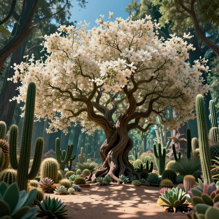 Photorealistic digital art of a sunlit desert garden with a majestic, twisted tree adorned with white blossoms, surrounded by cacti and succ