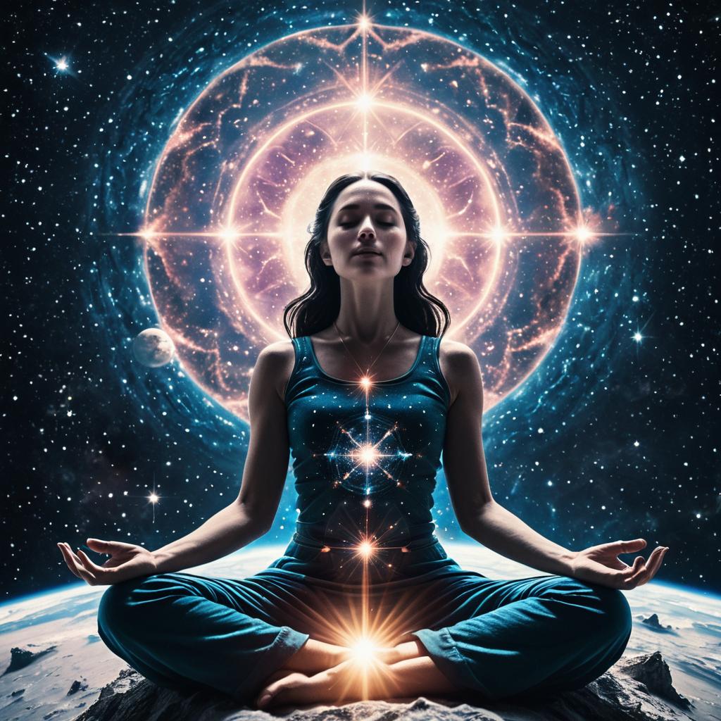 A young woman meditating in a cross-legged position in outer space, surrounded by stars and cosmic nebulae. She is wearing a dark blue tank top and pants, with a glowing set of bright light orbs aligned along her body, symbolizing energy centers. Behind her, a large circular nebula emits a soft radiant halo. The image conveys spirituality, cosmic energy, and meditation in a futuristic space setting.