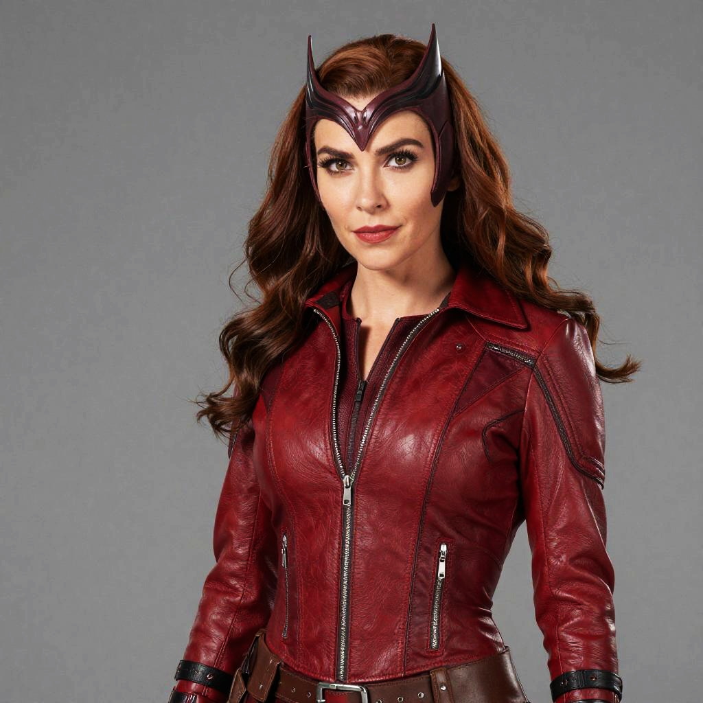 Scarlet Witch Apparel Costume, a woman in a red leather jacket and black gloves