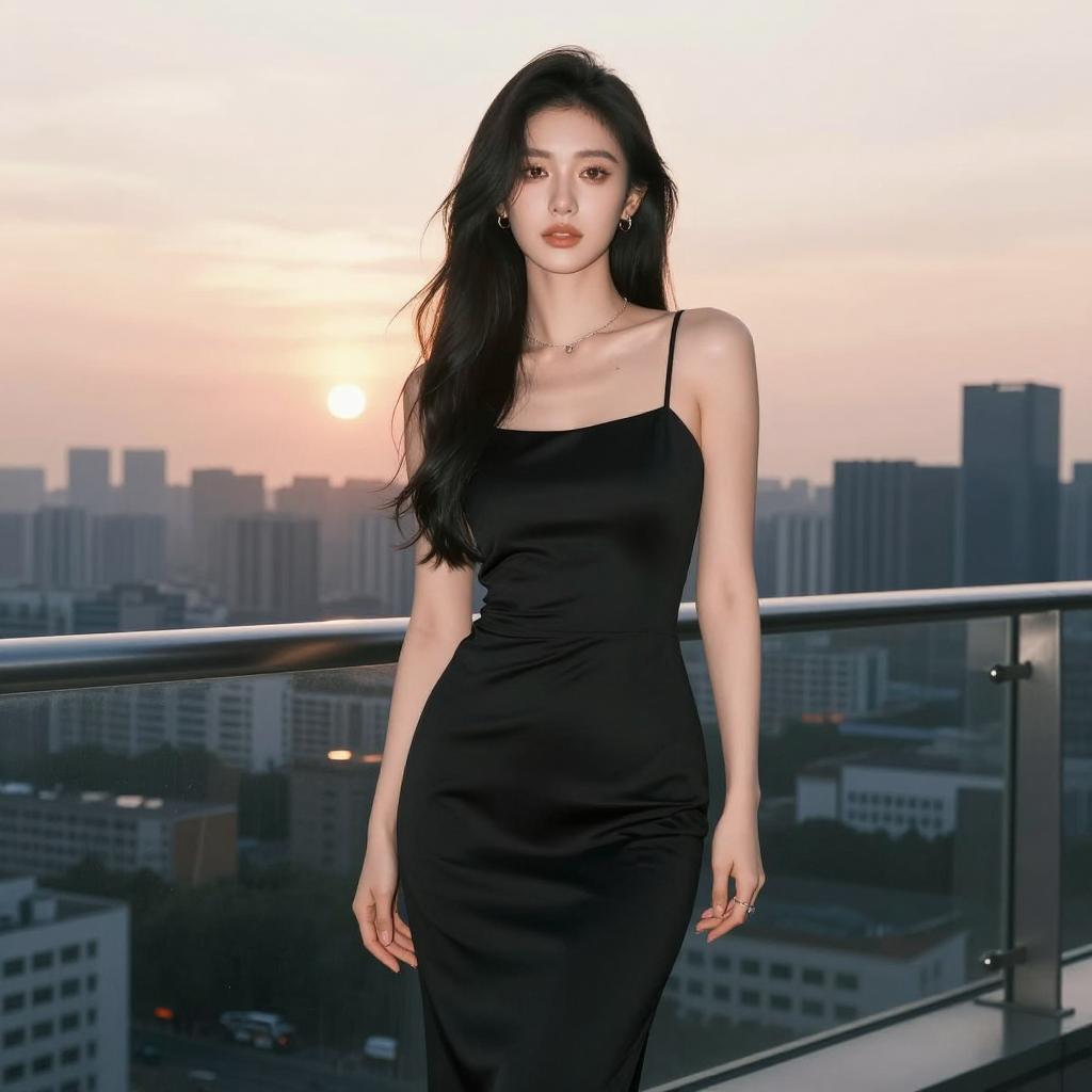 A stylish young woman poses confidently in a chic, form-fitting dress, showcasing a modern and elegant commercial lifestyle. The soft pink hue of her outfit reflects current fashion trends, while the backdrop of a quaint storefront enhances the vibrant urban ambiance.