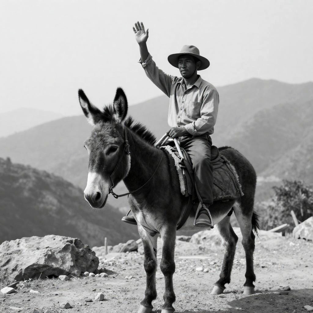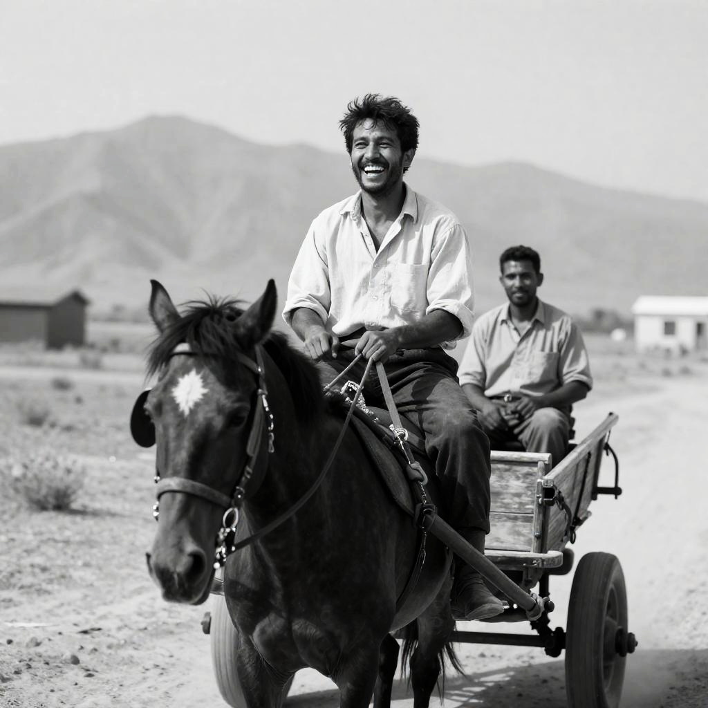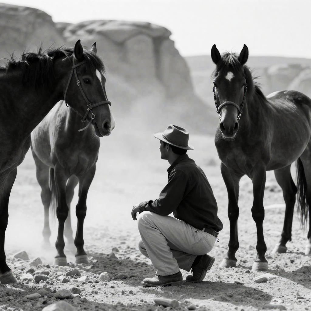 Black and white photograph of two men in a rocky desert landscape. One man, wearing a hat and shirt, leans forward to adjust the bridle of a horse. Both men have rugged, unshaven faces. The horse stands still, facing forward. Large rock formations fill the background. The men are positioned in the center, with the horse slightly to the right.