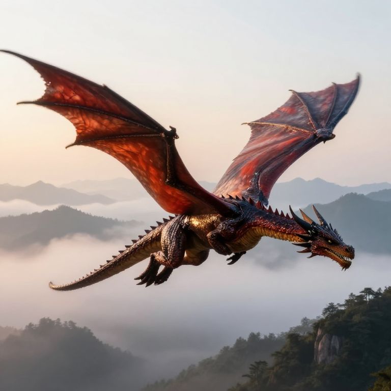 Photorealistic digital artwork of a majestic red dragon soaring through a misty mountain landscape at sunrise. The dragon's scales are dark red with a glossy texture, and its large, membranous wings are outstretched, displaying intricate vein patterns. Sharp spines run along its back and tail. The background features rolling mist-covered mountains with a soft pink and blue sky, adding a serene yet mystical atmosphere. The dragon's intense gaze and powerful wings create a dynamic sense of motion. The image combines fantasy elements with realistic textures and lighting.