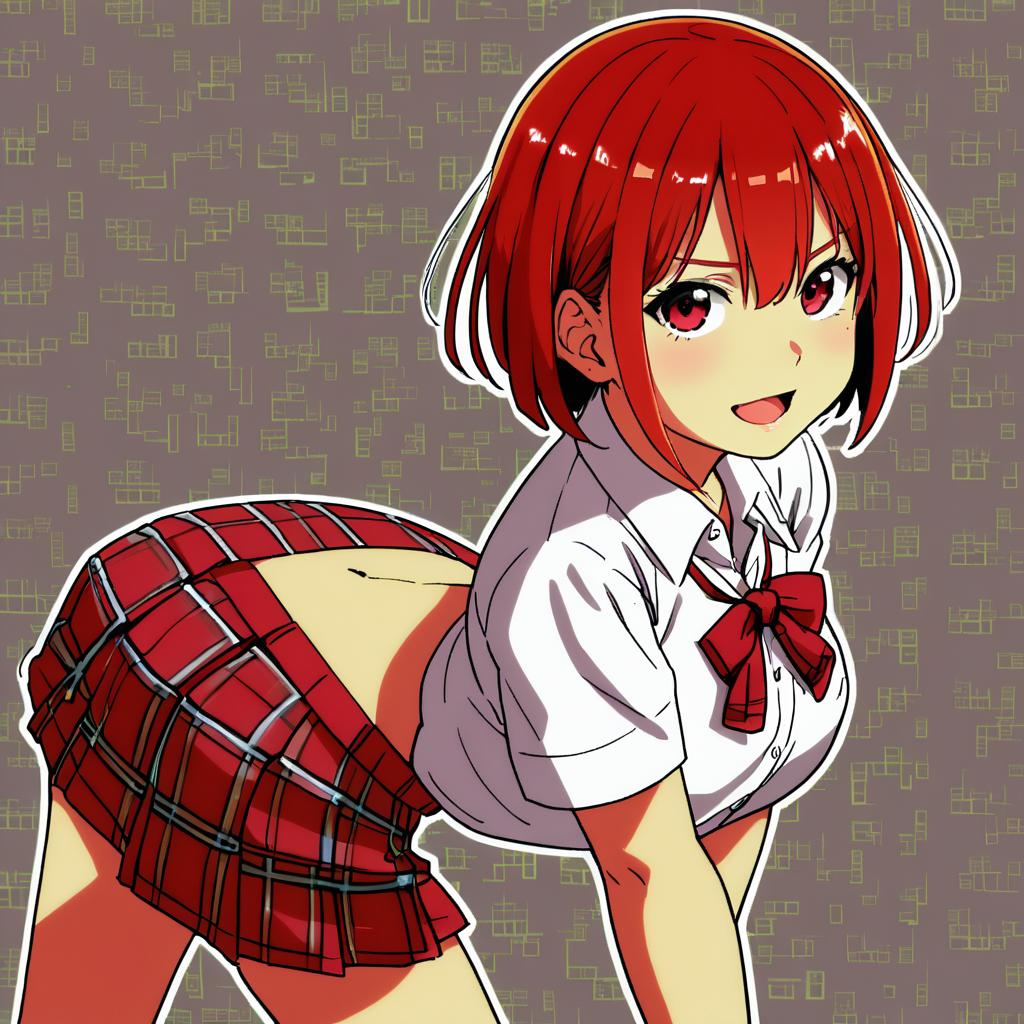 Aizawa tomo, tomo-chan wa onna no ko, 1girl, fang, red eyes, hair between eyes, red hair, short hair, large breasts, ass, navel, school uniform, by artist matsui yasutsugu, animagine