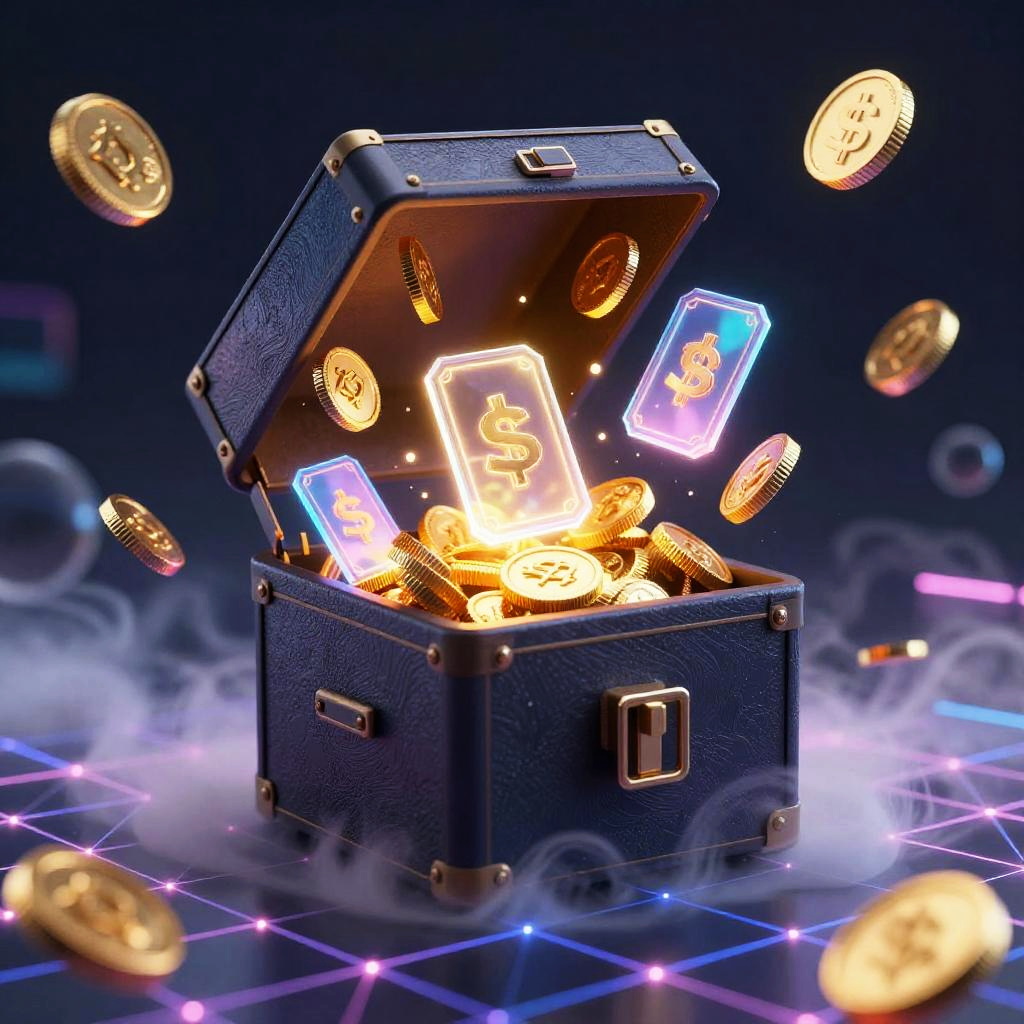 Crypto mystery box opening to reveal floating golden coins and holographic tokens, surrounded by swirling mist and neon grids, sci-fi digital art, cinematic lighting