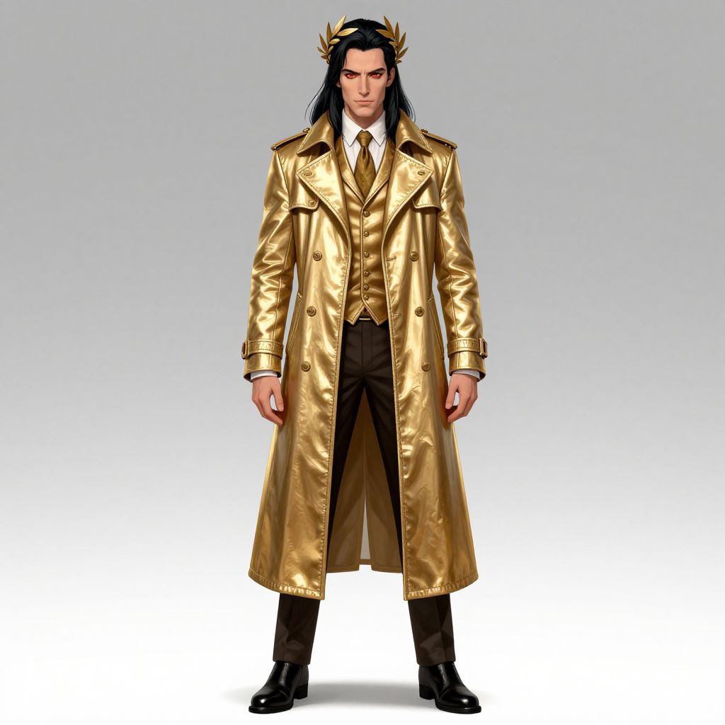 Millionaire human male, full body gold trench coat, aristocrat, character concept art, costume design, red eyes, long black hair, laurel wreath, trending on artstation, artgerm, wlop