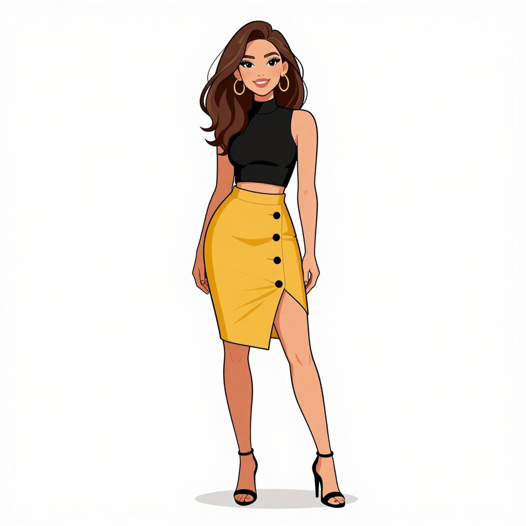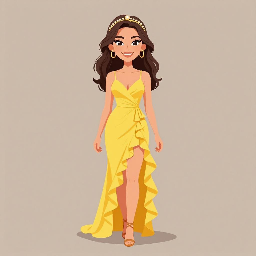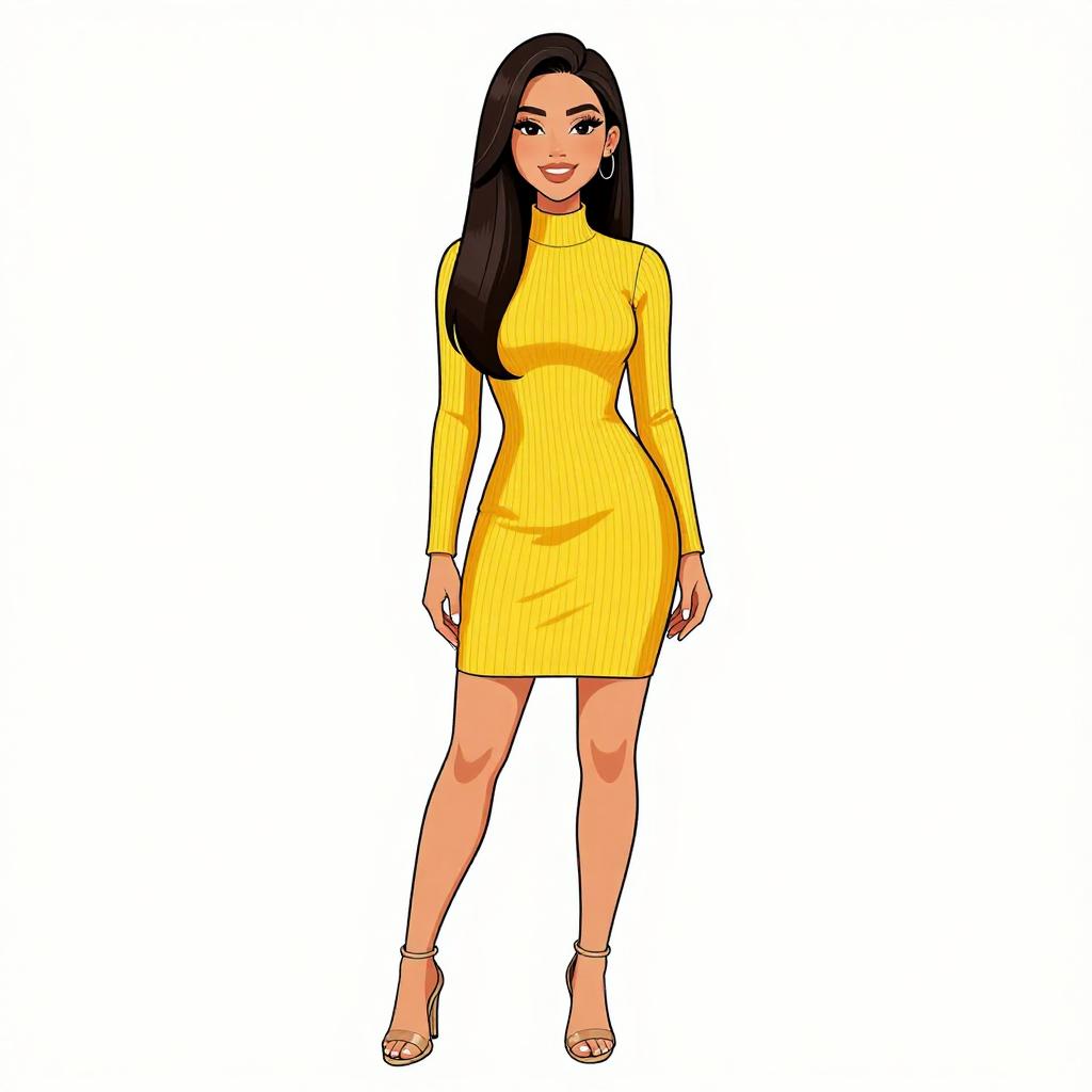 Woman with pretty face and pretty hair. smiling Woman, contemporary streetwear, bright yellow ribbed knit mini dress, front cut-out with lace-up detail, long sleeves, high waist, white quilted shoulder bag with chain strap, nude strappy high heels, photo studio background. --sref 1467