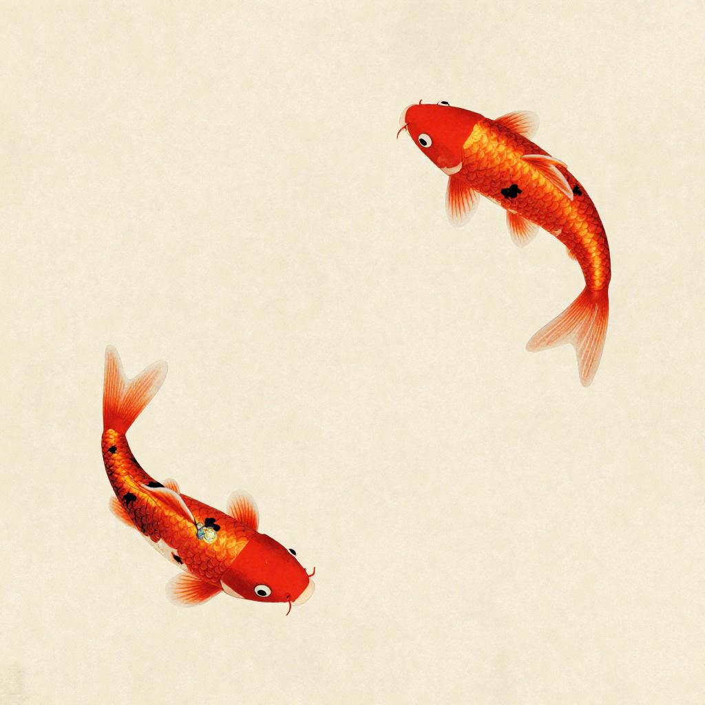 Create a minimalist Japanese woodblock wallpaper featuring lone crimson koi in the style of Katsushika Hokusai. This design combines magical realism and charm, showcasing illustrative elements against a muted cream paper texture backdrop.