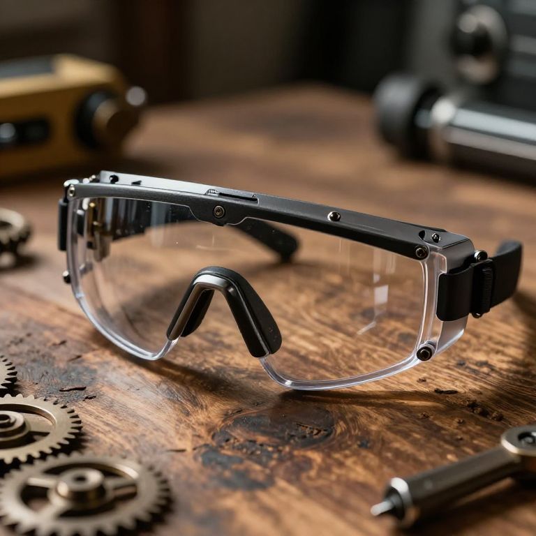Photograph of a transparent, black-accented, futuristic safety visor on a rustic wooden table with metallic gears and tools in the background.
