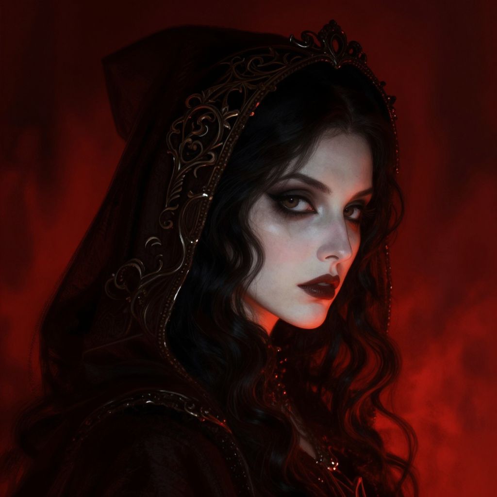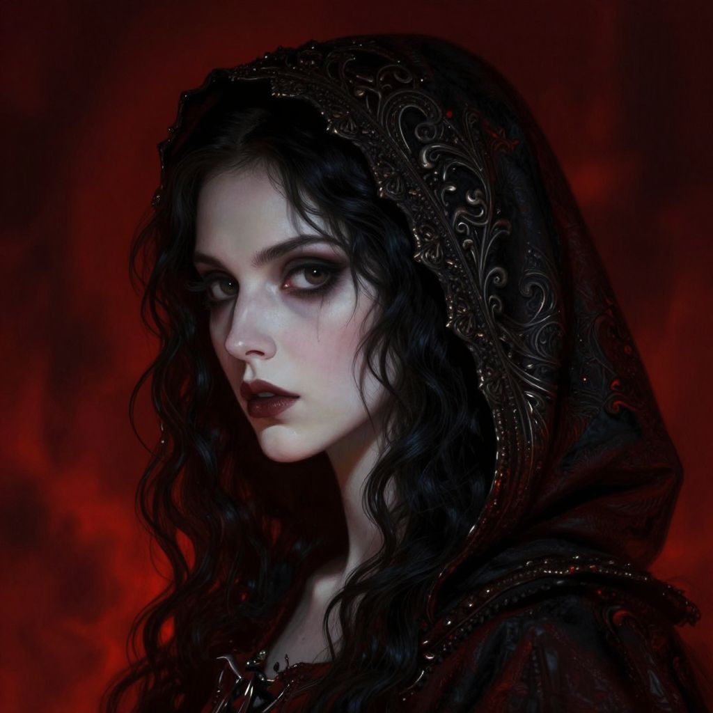 Digital painting of a hauntingly beautiful woman with pale skin and dark, wavy hair in a three quarter side view close up shot, Her face is framed a dark intricately ornamented hood, creating a gothic, otherworldly appearance, She has intense, piercing eyes and a solemn expression, The background is a deep, fiery red, enhancing the dark, eerie atmosphere, The lighting is low, casting dramatic shadows that emphasize her haunting allure, The image is viewed from a slightly low angle, making her appear dominant and mysterious, The overall style is dark fantasy and retro horror art
