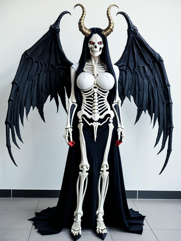 Photo-realistic cosplay photo of person in ainz ooal gown costume. 1girl, demon girl, demon horns, yellow eyes, red eyes, hair between eyes, black hair, long hair, large breasts, black wings, skeleton. full body shot