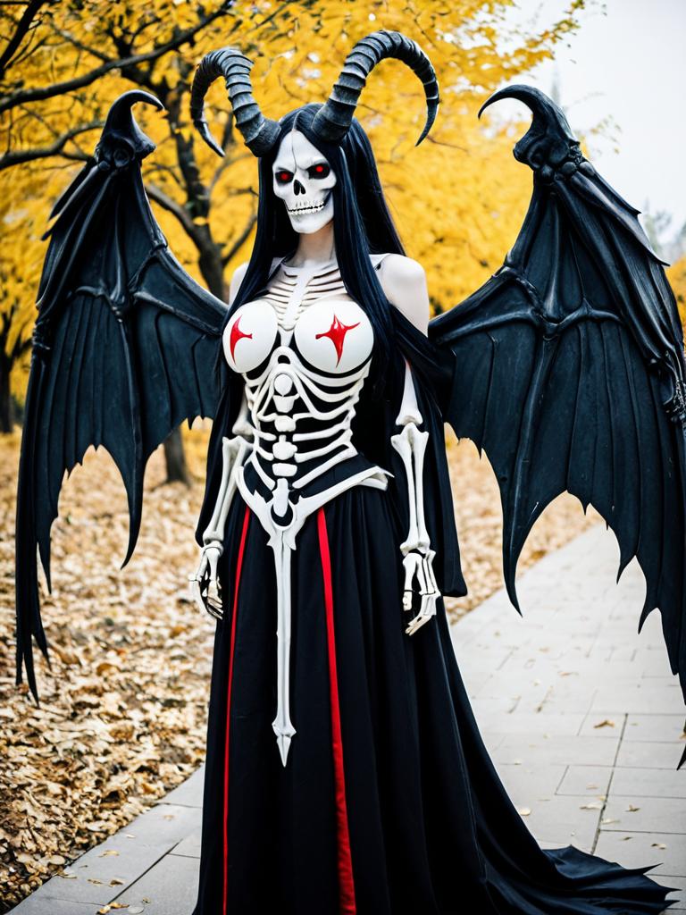 Full body shot of a person in a detailed dark demon cosplay costume inspired by Ainz Ooal Gown. The costume features a skull mask with red eyes, large curved black horns, skeleton-inspired chest and arm armor, and large black bat-like wings. The subject has long black hair and is dressed in a flowing black and red gown. The background shows a park scene with yellow autumn foliage and fallen leaves on the ground.