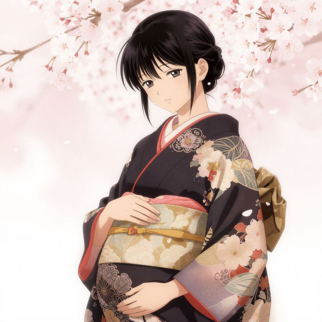 Pregnant anime girl wearing a traditional kimono, cherry blossoms falling around her, intricate patterns, soft lighting, delicate features, tranquil and elegant scene