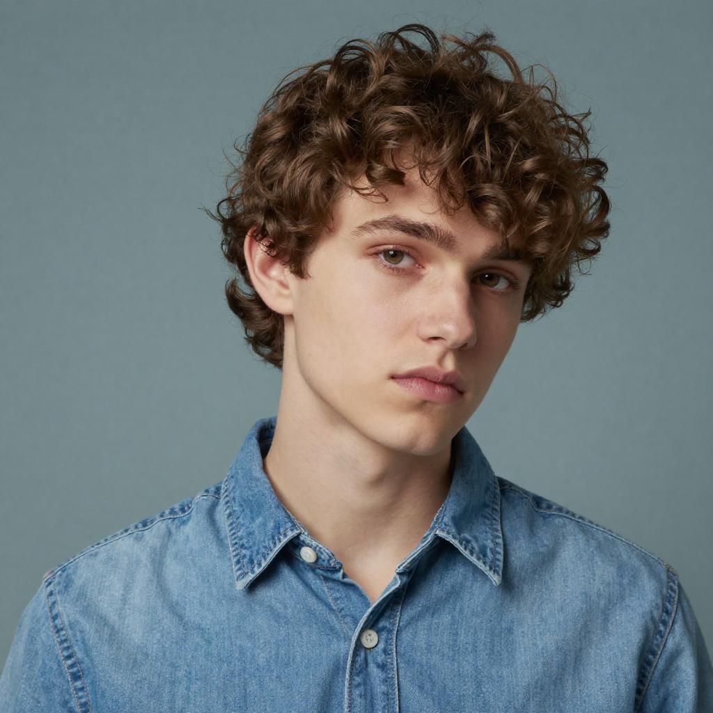 Photograph of a young man with curly brown hair, wearing a light blue denim jacket over a high-neck shirt. He has a serious expression and is looking slightly to the side. He's carrying a brown leather crossbody bag on his right side. The background shows a partly cloudy sky with soft, white and gray clouds. The overall vibe is casual and slightly moody.