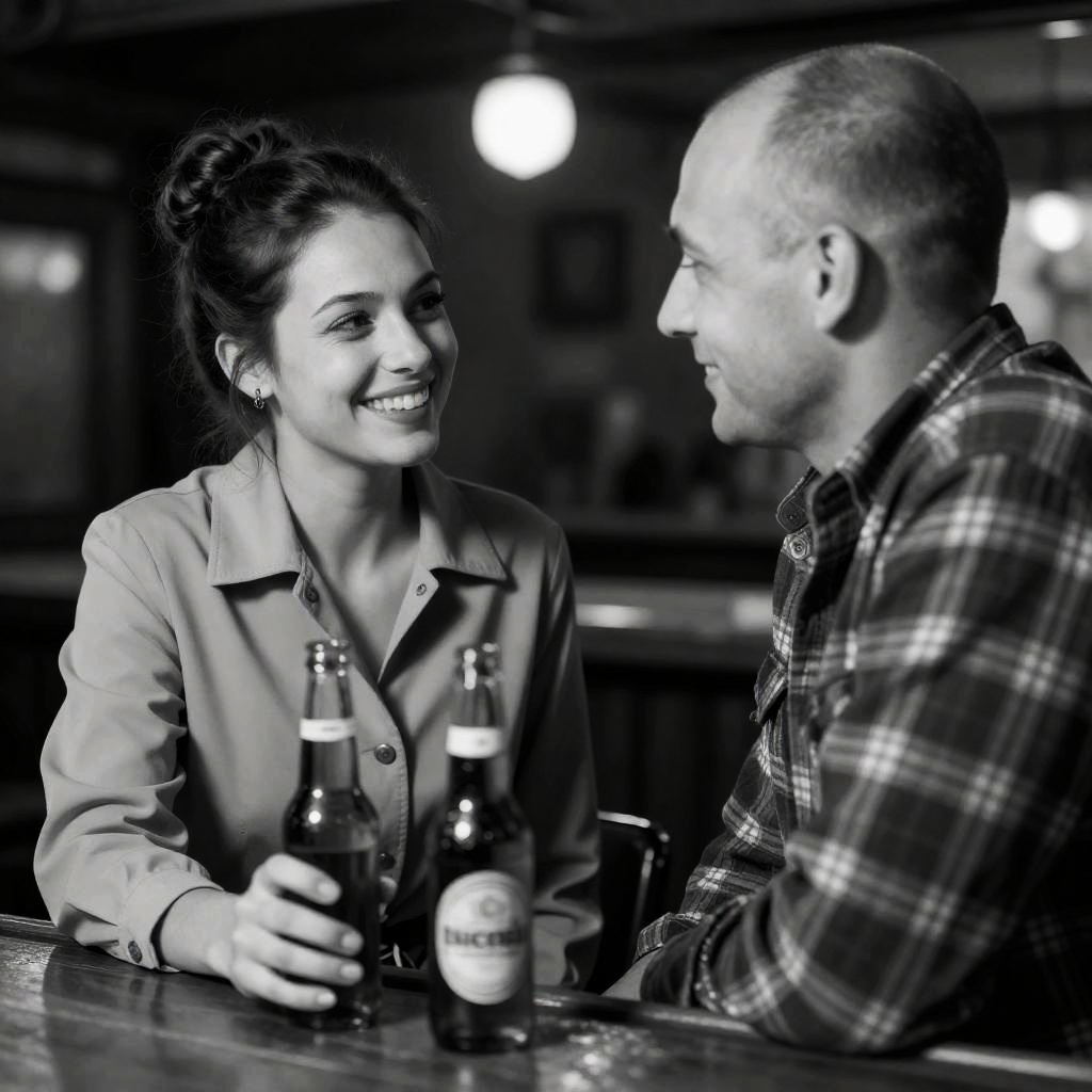 Black-and-white photograph of a man and woman in a kitchen. The man, bald with a serious expression, leans over the woman, who looks up at him with a concerned expression. She has dark hair in a ponytail, wearing a checkered shirt. Kitchen background includes plates on the wall, a poster, and various kitchen items. The man wears a sweater over a collared shirt. The woman's hands are clasped in front of her.