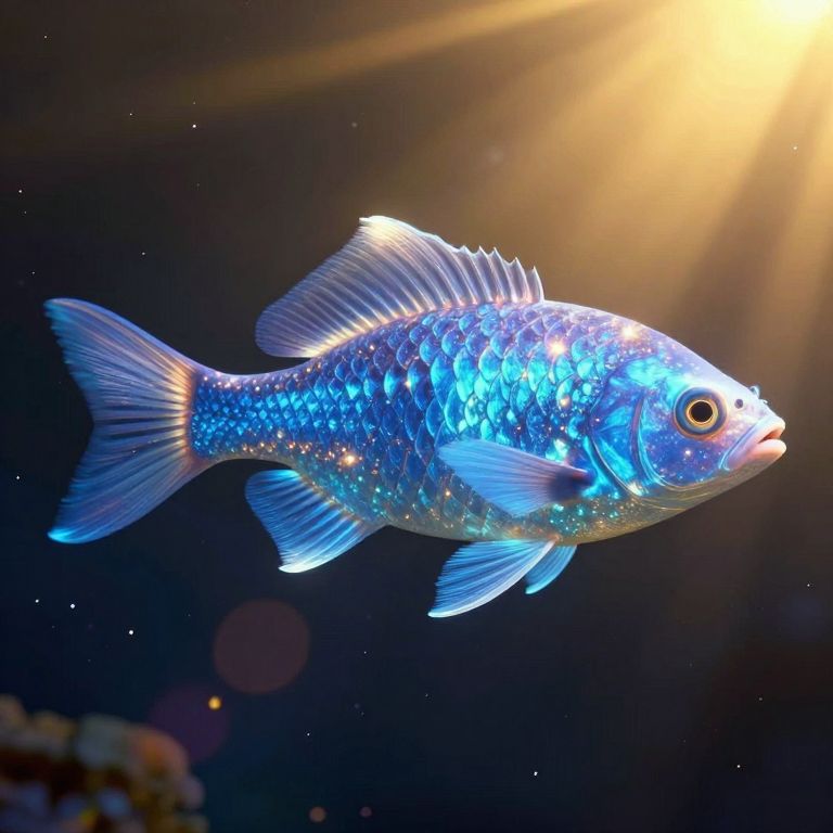 A luminous, computer-generated fish swims through a cosmic expanse, its scales shimmering like liquid stardust under dramatic golden-hour lighting, evoking a surreal blend of digital artistry and celestial wonder.