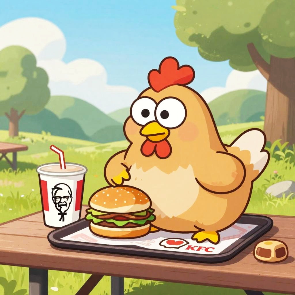 Chicken eating KFC on a vintage farm, oil painting style, warm earthy tones, rustic barn background, detailed brush strokes, classic countryside scene