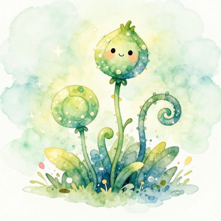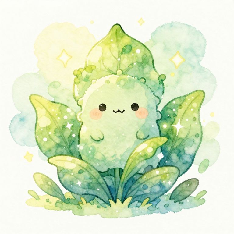 Humor watercolor anthropomorphic plant, cute kawaii style, loose watercolor art, mystical, ethereal, magical, whimsical, full watercolor painted background,