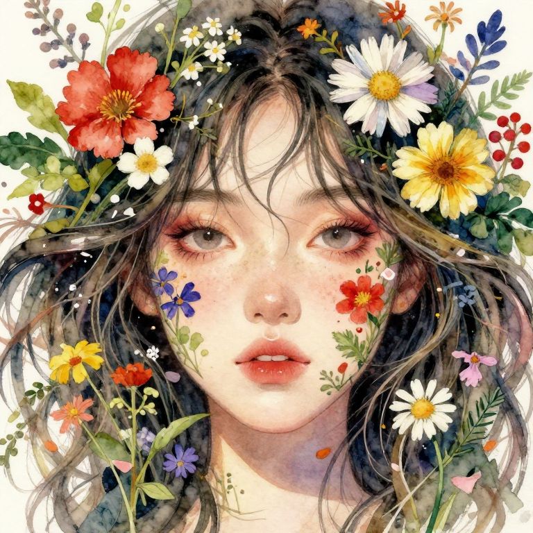 This digital illustration features a young woman with fair skin and large, expressive brown eyes. Her wavy, dark brown hair is adorned with a vibrant floral crown, including red, white, yellow, and blue flowers, as well as green leaves. Her face is partially covered by the flowers, with some petals resting on her cheeks and lips. The background is a white, slightly textured canvas, emphasizing the colorful floral arrangement. The style is highly detailed and realistic with a touch of fantasy, reminiscent of watercolor paintings. The woman's delicate features and the natural beauty of the flowers create a serene, ethereal effect.