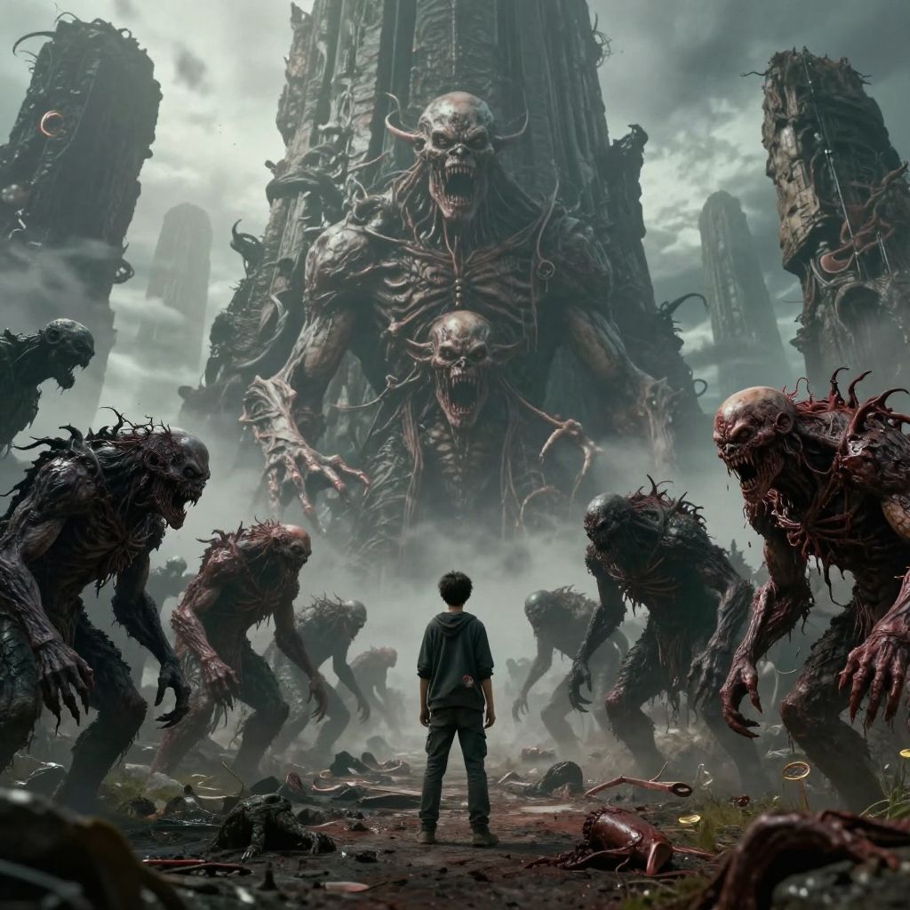 Masterpiece, best quality, cinematic style, one boy standing against an army of monsters, gruesome creatures, grotesque beasts, surreal megalithic mountain, dark fantasy, ultra hd, 8k, perfect resolution, excellent intricate details, rich colours, great exposure