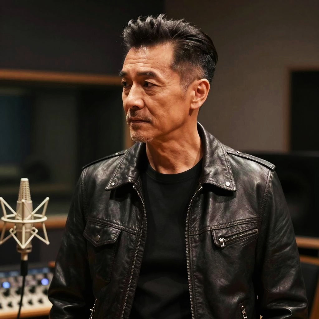 Side Part Undercut hairstyle on middle-aged man, wearing leather vest and shirt, in recording studio, captured in fashion editorial style with dim colored light.