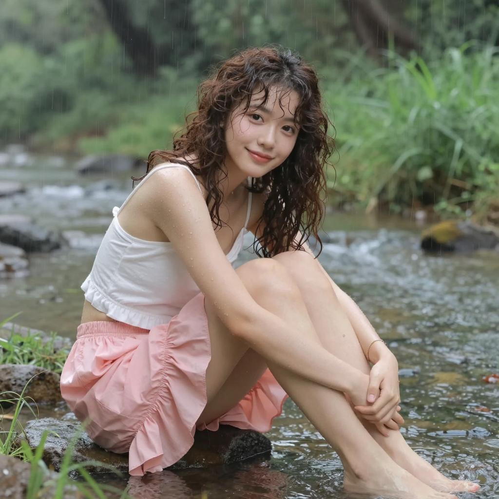 Digital illustration of a woman with closed eyes, wet brown and blue hair, wearing multiple colorful beaded bracelets. She rests her head on a branch with pink and white flowers. Raindrops fall on her face and hair. Her skin is light with a slight tan. Green leaves are on the branch. Her left hand is raised, fingers gently touching her head.
