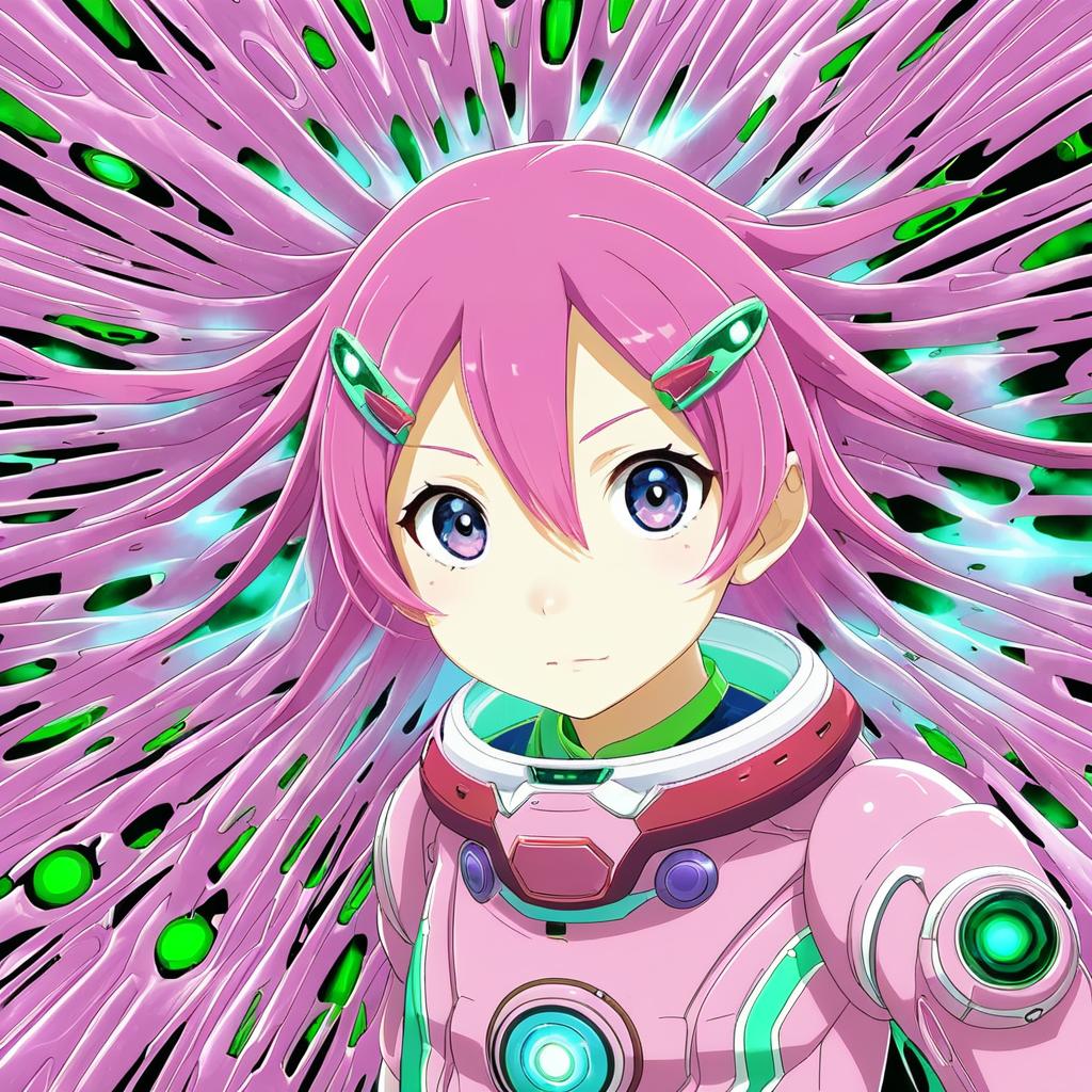 Close-up illustration of an anime girl with long pink hair, purple eyes, and green hairclips. She is wearing a futuristic pink and green suit with glowing elements, inspired by the anime series Eureka Seven. The artwork features dynamic and colorful details with a sci-fi aesthetic.
