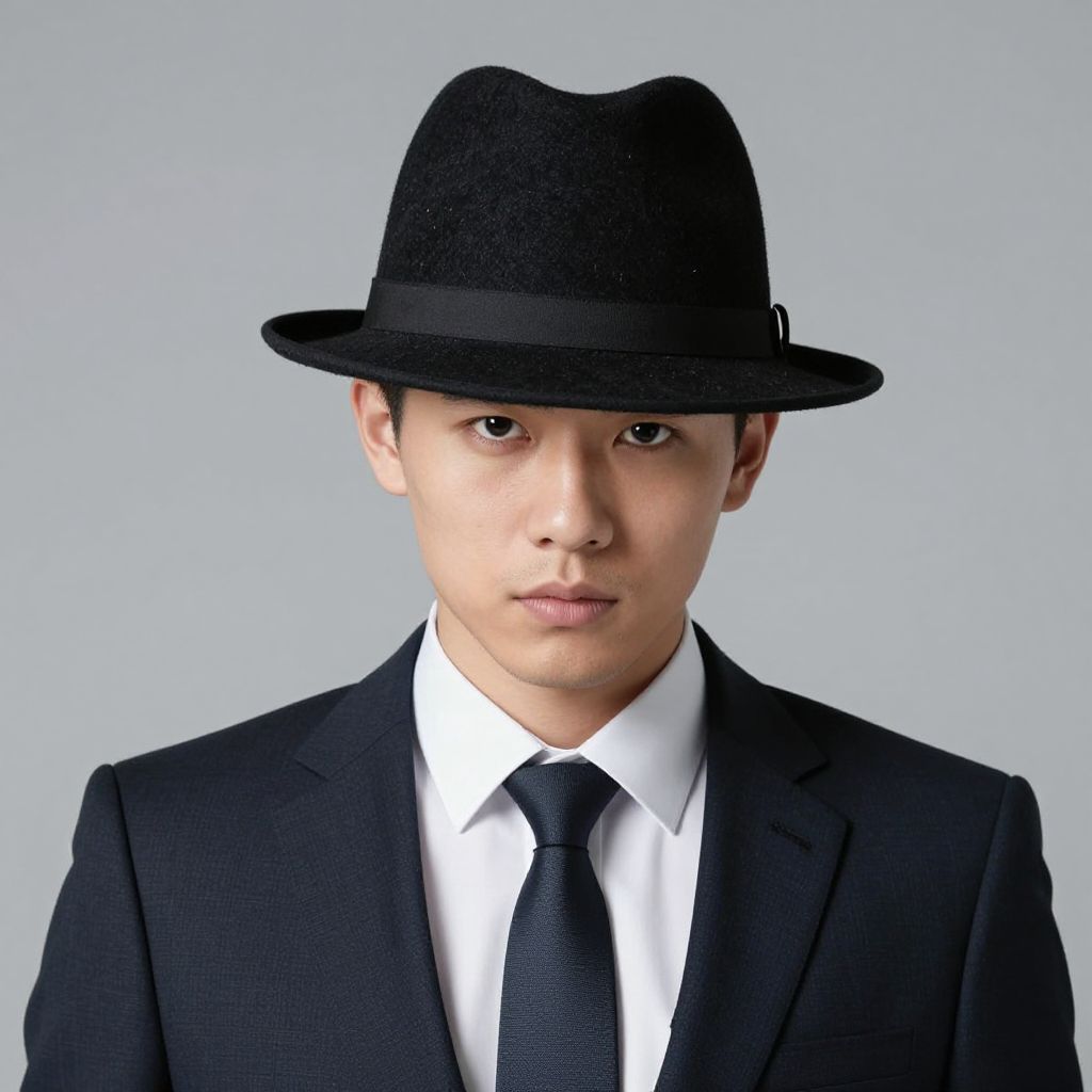 Photograph of an Asian man with fair skin and short, light brown hair, wearing a black fedora hat, a black suit jacket, white dress shirt, and black tie. He has a neutral expression, with slightly parted lips and brown eyes looking directly at the camera. The background is a plain, light grey, creating a minimalist and formal appearance. The image is sharply focused, emphasizing the contrast between his dark clothing and the light background.