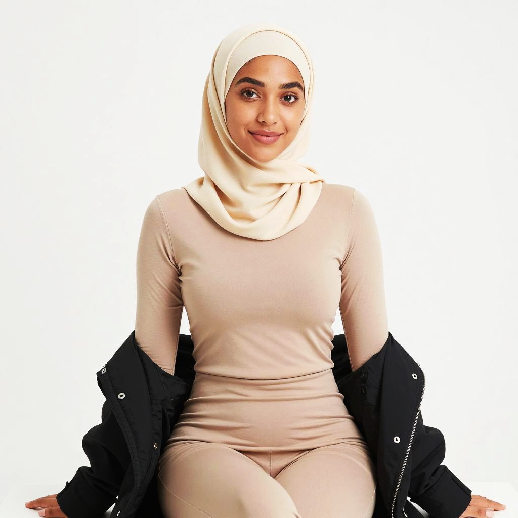 Photograph of a confident woman with medium brown skin, wearing a beige hijab, matching long-sleeve bodysuit, and black jacket draped over her arms. She's sitting on a white bed with a relaxed pose, smiling softly. Her makeup is subtle, with pink lipstick. The background is a bright white, making her outfit and hijab stand out. The overall vibe is casual and stylish.